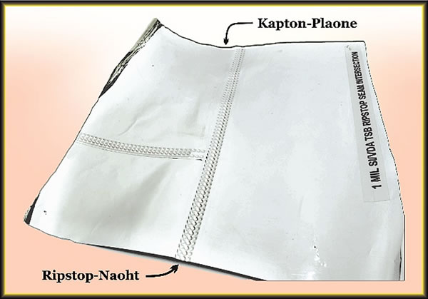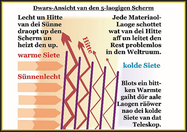 Worümme fief Laogen? Wotau hätt dei Sünnenscherm fief Laogen un nich blots eine einkelne dicke? Jede naokaomen Laoge van den Sünnenscherm is köller as dei vörige. Dei Warmte straohlt tüschken dei Laogen rut, un dat Vakuum tüschken dei Laogen isoleiert gaut. Was dei Sünnenscherm blots groot un dick, güng dei Warmte dor bäter dör, as bi fief Laogen, dei dör ein Vakuum trennt sünd. Dei Sünnenscherm bestaiht ut ein lichtet Materiaol mit besünnere thermischke Eigenschkupen. Man neumt dat Wark Kapton, dat uck noch extrao beschichtet is.