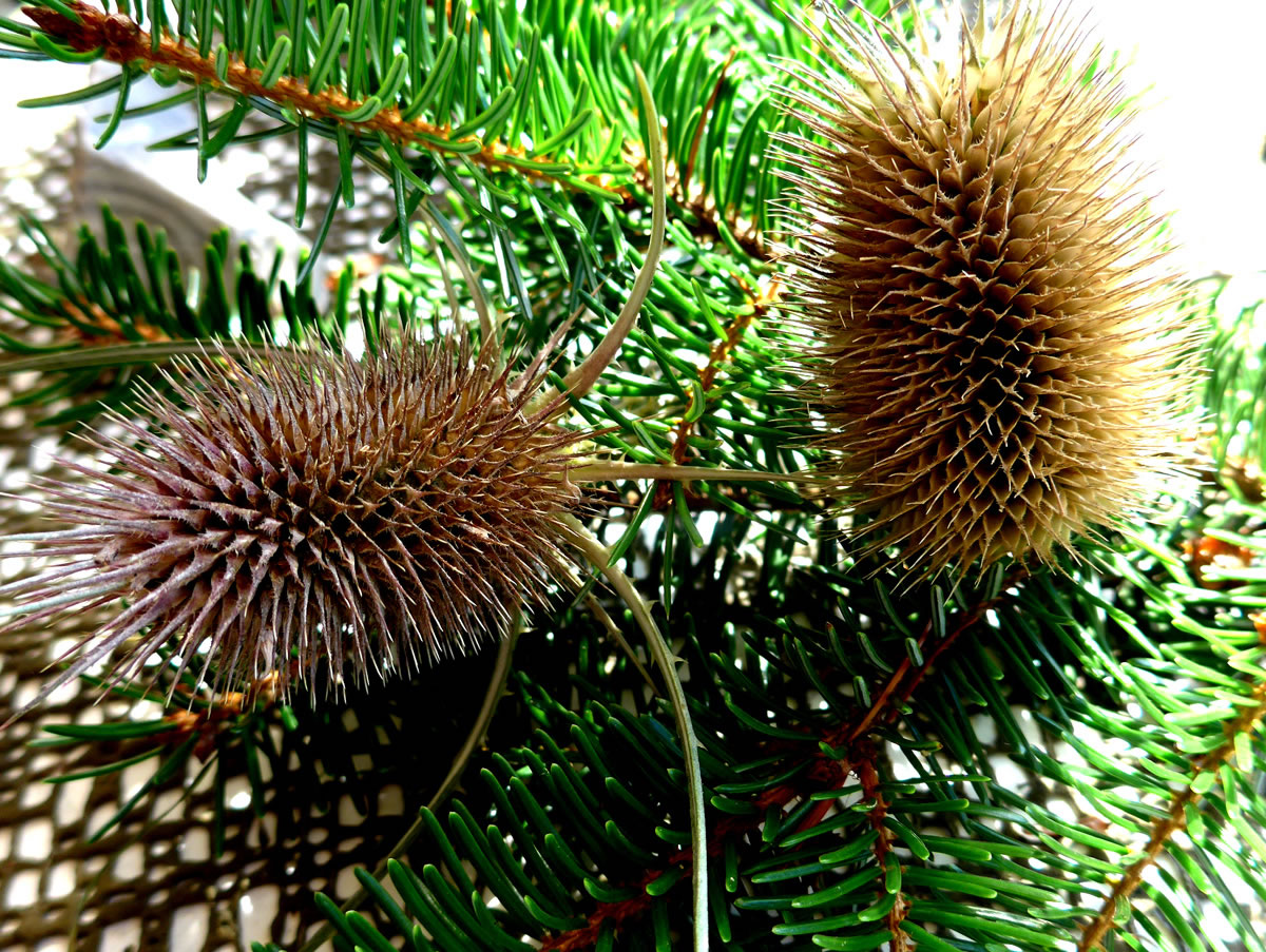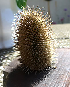de drögen Köpp vun de wilde Karde up en Stricknadel to steken