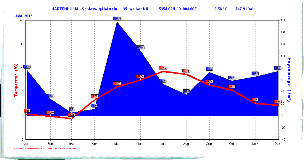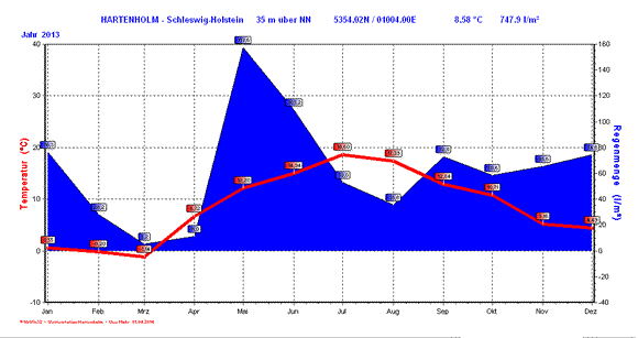 Klimadiagramm Hartenholm för 2013. Quelle: