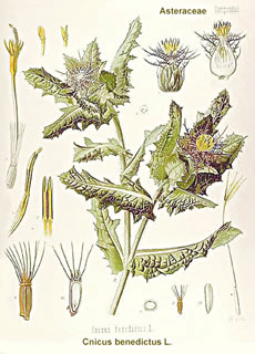 is" orrer Utspruch. Benediktenkruut is en Plant, de as en Distel utsüht. Se driggt vun Ende Juni bet Anfang August gele Blöden. Se warrt een Johr olt, is also "einjährig". All Bläder hebbt an de Spitz un an de Lappen enen Stachel. De Bläder sünd zottig, de Stengel hoorig. De Plant wasst wild an dröge Stellen. Se stammt ut dat Mittelmeergebiet. Se is al recht fröh in Europas in Kloostergoorns anplant worrn. Se smeckt bitter, beten solt. Benediktenkruut is en typisch Bitterdroge. Se findt Verwenden as bitter Magenmittel wenn dat mit 't Verdauen nich so klappt, bi swak Verdauen, gegen Gallen- un Leberpien, ok bi Gicht, Asthma, Harnbesweer. |