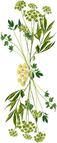 Wörtel (Radix levistici); in'n September bet Oktober vun Planten, de 2 bet 4 Johr olt sünd |