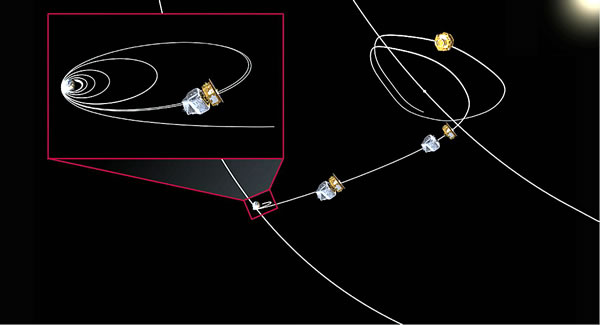 Sünne (gäl) un Eern (blaw). Lagrange-Punkte sünd