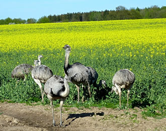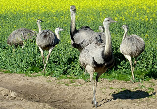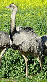 Wi hebbt noch mit den Besitzer vun den Rietstall snackt. De kunn sogoor Plattdüütsch. He hett uns noch vertellt, dat de Beek mank de Wischen de Grönau is. De groten komischen Grasbüschel kenn he ok, wüss aver nich, wat dat weer. Up unsen Nahuusweg snacken wi ganz begeistert vun uns Maifohrt. Wedder kemen wi an de Rapsfeller vörbi. Un dor stünnen doch an de een Kant vun en Rapsfeld en ganze Reeg Nandus. Anhollen un utstiegen weer eens. Mit den Knipskassen in de Hand slieker ik mi vörsichtig neger an de Nandus. De gröötst Nandu keem mi in de Mööt. He reck sien Kopp gefährlich hoch un keek mi mit sien scharpen Ogen an. Dor kreeg ik dat mit de Angst un bün gau wedder in't Auto stegen.