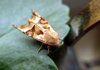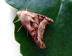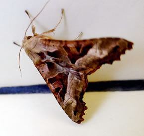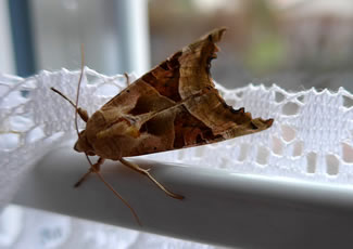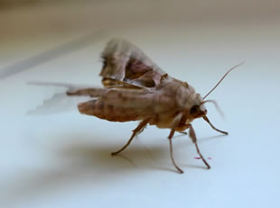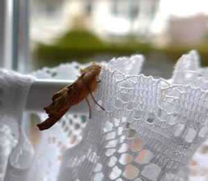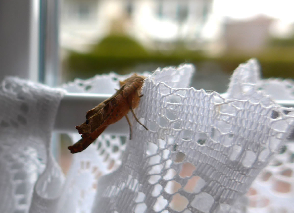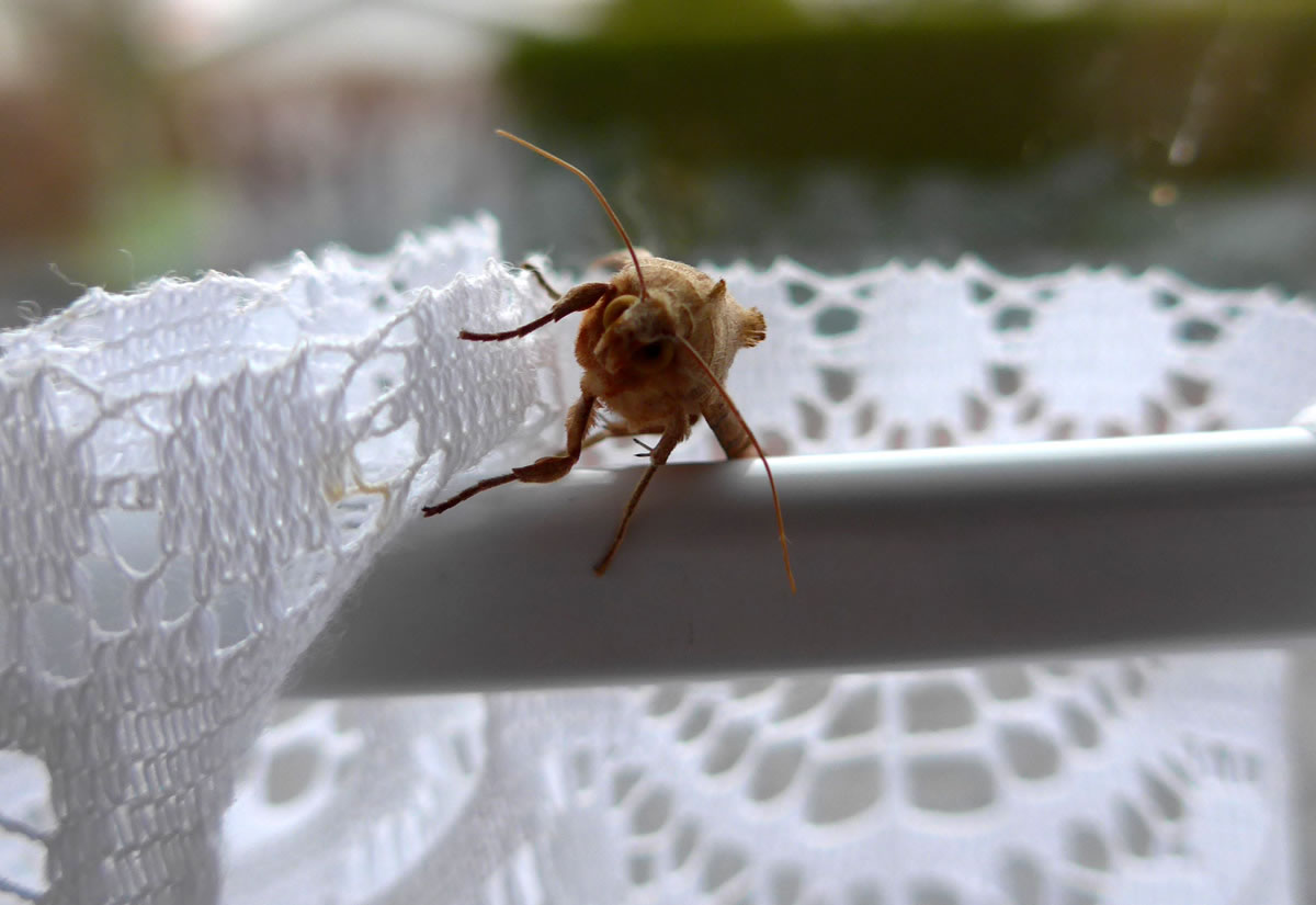 Dor seet doch wohrhaftig in de Gardin vun't Kökenfinster en Uul! Keen grote Uul mit en Fedderkleed, ne, en Nachttuul. Dat weer en Nachtfalter. So en smucke Uul heff ik dat eerst Mal to Gesicht kregen.