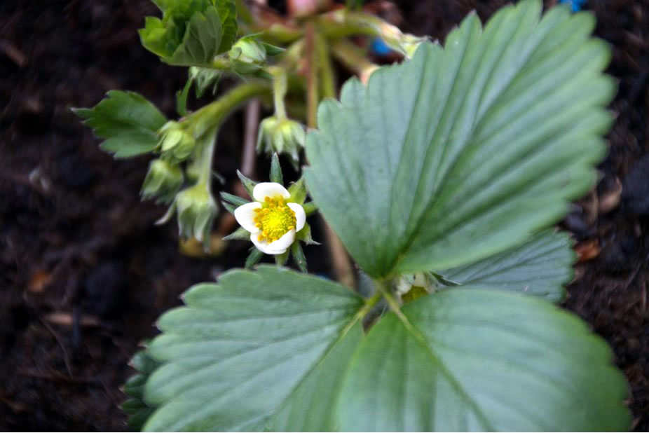 De eerste Eerdbeerblööt is so recht wat för't Hart. Schüchtern kiekt se ut den Strahlenkranz vun ehr Kelchbläder rut, bescheiden un strahlend. Eerdbeeren sünd Rosengewächse, un so lütt de Blööt is, verleugnet se dat nich: De Fieftall vun ehr Blödenbläder wiest ok op düsse Familie hen. De hoge Verwandtschap is aver noch in'n Winterslaap, wieldess de lütte Eerdbeer sik al truut. Ik drück ehr (un mi) de Dumen, dat keen Frost mehr kümmt. Ja, dat is wat för't Hart! Un later ok wat för den Gaumen. Op en gode Aarn! Dat Bild köönt