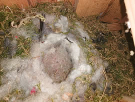 In uns Garrnschuppen hett en Meesch ehr Nest. An 17. Mai heff ik de lütten Vagels opnohmen. Un jüst 5 Daag later is dat Nest al lerrig. Ik weet, dat de lütten bet 20 Daag bruukt, flügg to waarn. Ik hööp, dat bi mien de Tiet gau lopen is un se heel vergnögt in de Lüfte flattern doht... sünst kunn een denken, dat se en Neströver to Opfer fullen sünd. Avers denn weer doch woll dat Nest tweireten oder? Ik warr dor mal'n Kamera hinstellen un kieken, wat in tokomen Johren passeert. De Biller köönt Se per Klick