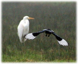 en gewöhnliche Elster, bloots in een Flucht mit den Reiher un