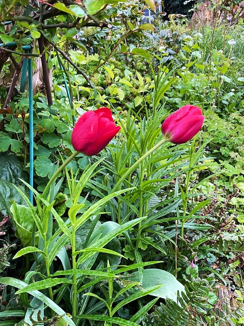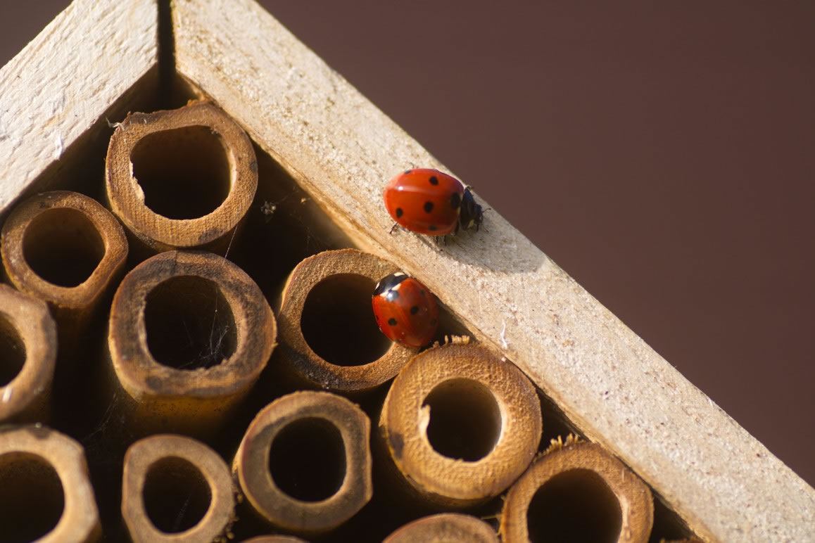 In'n Goorn is allens op eenmal los. De Planten, sogor de Rosen, kriegt Knubben un Bläder, de Immen sünd swoor in de Hornveilchen togang, de Vagels sammelt Nistmateriaal un ok de Marienkävers sünd waak, avers vör de nächtliche Küll söökt se denn doch noch mal Schuul, so as düsse twee Frünnen in mien Insektenhotel.