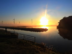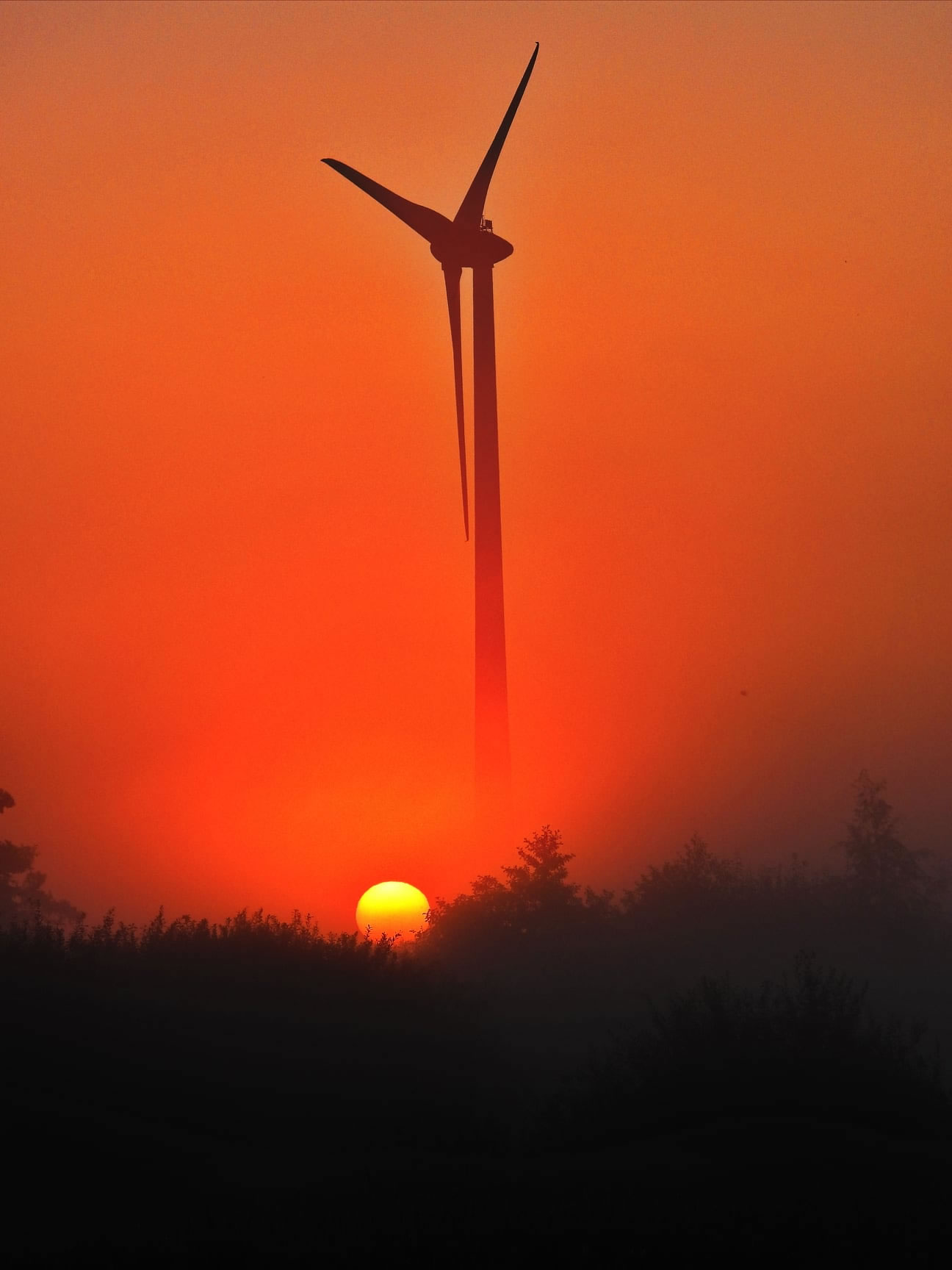 De Sünn un dat Windrad seht beid ut, as wulln se hooch opstiegen. De Harvstnevel licht sik. Dat grote Radnett vun de Krüüzspinn hett den Nevel infungen un glinstert in de eerste Sünn. So warrt se nich veel Büüt fangen, dat Nett is to good to sehn!