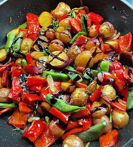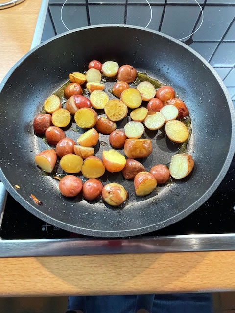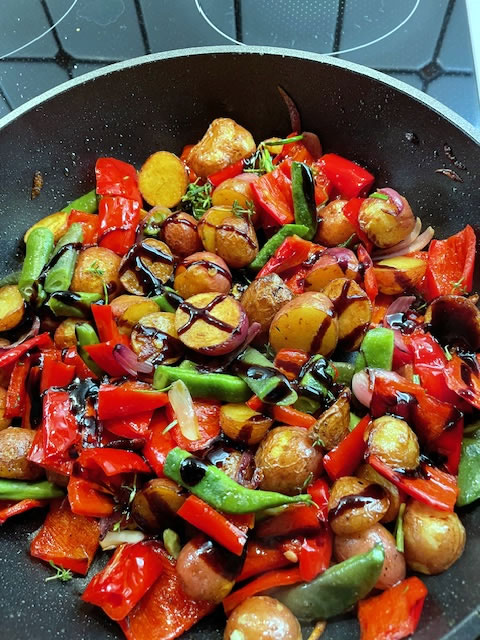nich köpen kann. Ik heff dat hüüt mal op de italjeensche Oort' versöcht. Mit rode Paprika, en rode Zibbel, en Handvull vun de letzten Stangenbohnen, Rosmarin un veel Tiemjaan mit Olivenööl inne Pann braat. Ik glööv, dat harr Oma sik ok smecken laten! Tiemjaan un Rosmarin, de wasst nu in mien Goorn. De Biller köönt