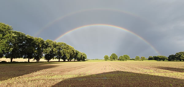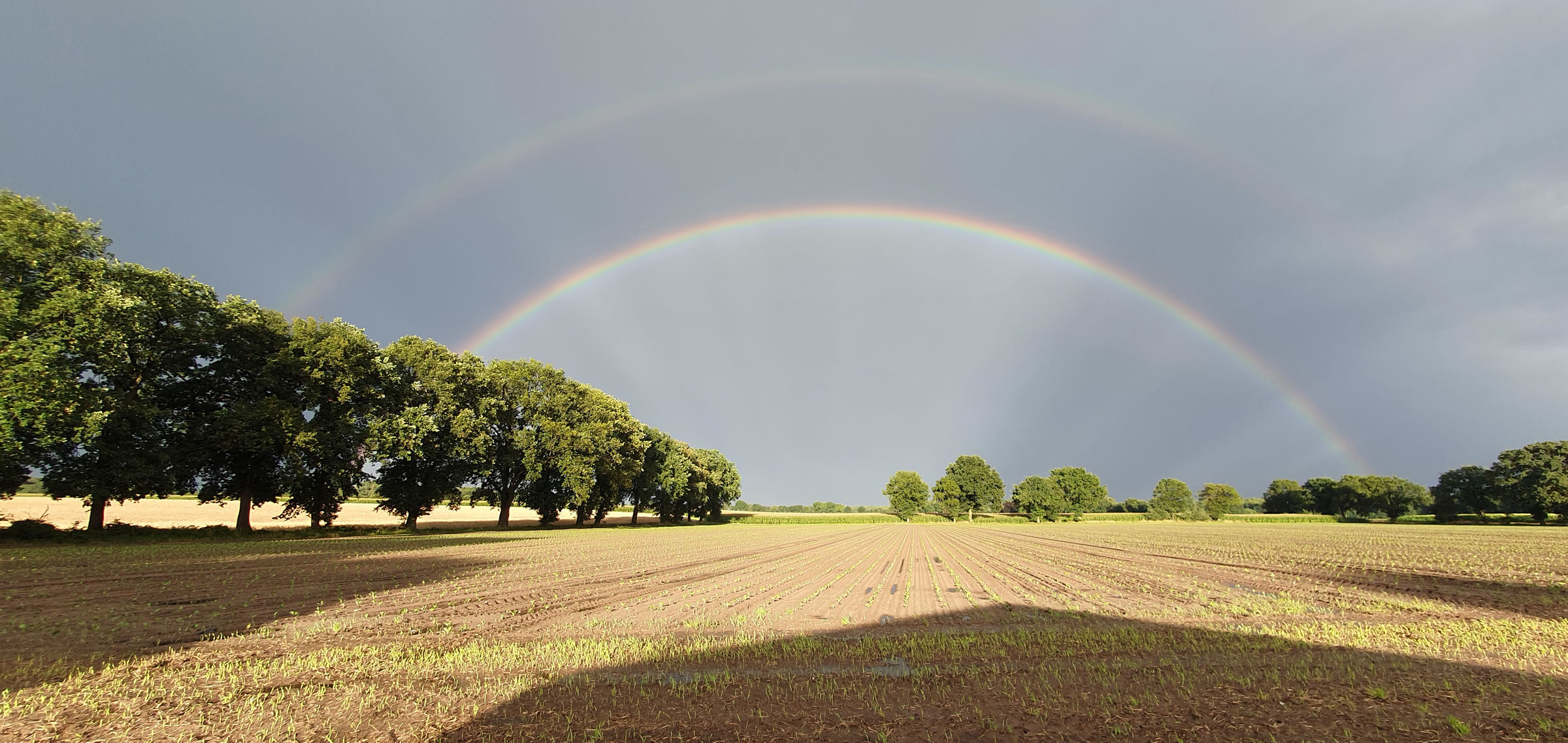 Na en avendlich Gewitter bi deep stahn Sünn wies sik gistern een vun de intensivsten Regenbagens, de ik sehn heff. Knipst heff ik em dör de Schiev. De twete Bagen is ok good to kennen (in't Foto links). De Regen driev noch in fiene Wulken in den helleren Ruum in't Bagenbinnere. En Bagen, de sik sehn laten kann, meen ik. Dat Bild köönt
