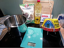 Hüüt wull ik nafüllen, de grote Röhr sehg meist lerrig un togliek teemlich schietig ut. Hm, is ja ok Schietweder, mal kieken. Nanu, is de gor nich lerrig? Dat Plastik schient vun binnen beslaan. Dor beweegt sik wat! Is en hungrige Lünk etwa dör en Foderlock sluppt? Dor passt de doch gor nich rin?! Ik mutt baven den Deckel opmaken.