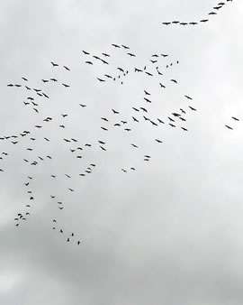 Jedeen Avend in düsse Johrstied: grote Swarms vun Dohlen un Kreihn. Jüst nu even ok en lütte Göös-Formaschoon. De Göös treckt bald weg, avers de Dohlen un Kreihn blievt hier un bildt liekers de groten Swarms, sünnerlich avends, denn se slaapt alltohoop in grote Kolonien. So sünd se sekerer vör Fiende. Mennigmaal slaat sik Toogvagels dorbi an. Opnahmen in #Elmshorn blangenbi: #supernormal (all hier hebbt en Vagel en coole Ort för en Nest!). De Biller köönt