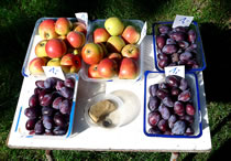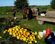Annern Moorn weck uns Sünnenschien un wi möken uns up den Weg. Vör jeden Buurnhoff stünn in Körf godes Aavt. Neven dat Aavt weer en Doos för Geld. Wi müssen nich eerst op de Buursfruu töven. Deelwies weer ok all Most in Flaschen un Marmelaad utstellt. Wi hebbt uns goot bedeent. Up den Nahuusweg föhrn wi noch an Opas Biohoff vörbi. De harr junge Kantüffeln un frische Eier. Vör sien Huus stünn en Pfirsichboom. De Pfirsich weern ok al riep. An sien Huusdöör hüngen de eersten Wiendruven. Vun allens hebbt wi wat afkregen. Riek beladen föhrn wi na Huus.
