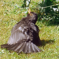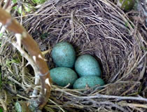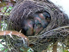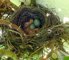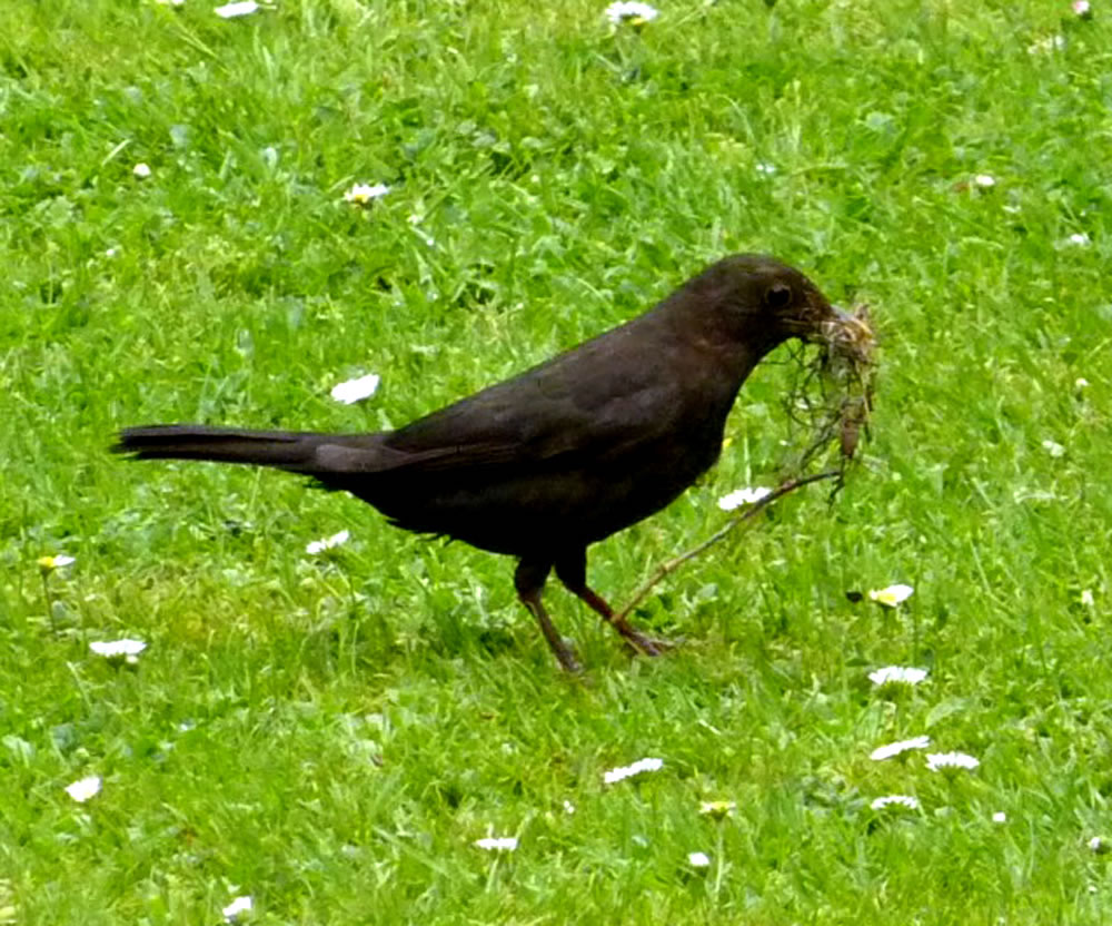 Ik heff natürlich den Nestbuu genauer ünnersöcht. As de Flugverkehr vörbi weer, heff ik en fardiges Nest vörfunnen. Bald legen Eier in dat Vagelnest. Bi veer Eier hebbt se uphört. Nu seten se afwesselnd up de Eier. To de Fröhstückstied weern se immer wedder to Stell. Enes Dags keem de Amselmann mit Würmer in sien Snavel anflagen. Dat weer en Teken, dat de Kinner ut dat Ei krapen weern! Immer wedder keem nu en vun de Öllern mit Würmer anflagen. Se wöörn lutstark vun de Kinner begrööt: "Hunger, Hunger!" Wenn ik wat vun dat Familienglück sehn wull, wöör dat Tiet! Ik heff mi den Tritt ut den Keller haalt. Vorsichtig klatter ik hoch. Dor kunn ik de Familie bekieken. Fief lütte nakelte Amselküken legen in dat Nest! Hoffentlich kunnen de Öllern ehr Kinner düt Johr groot kriegen. Süht good ut düt Johr. Letzt Johr hett de Heister se haalt. Dat Johr vörher harr de Eekkater se klaut. Amseljunge weern wull bi de annern Deerten en begehrten Leckerbissen. De Biller köönt Se per Klick