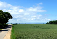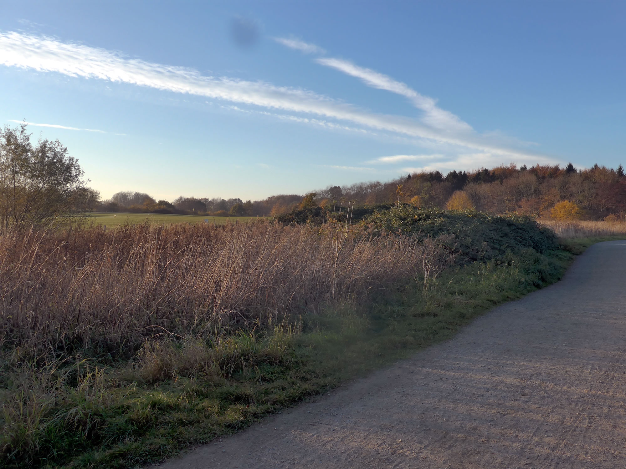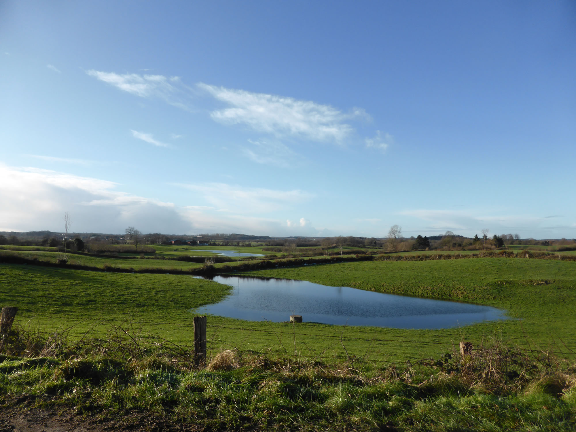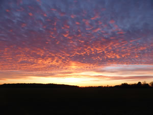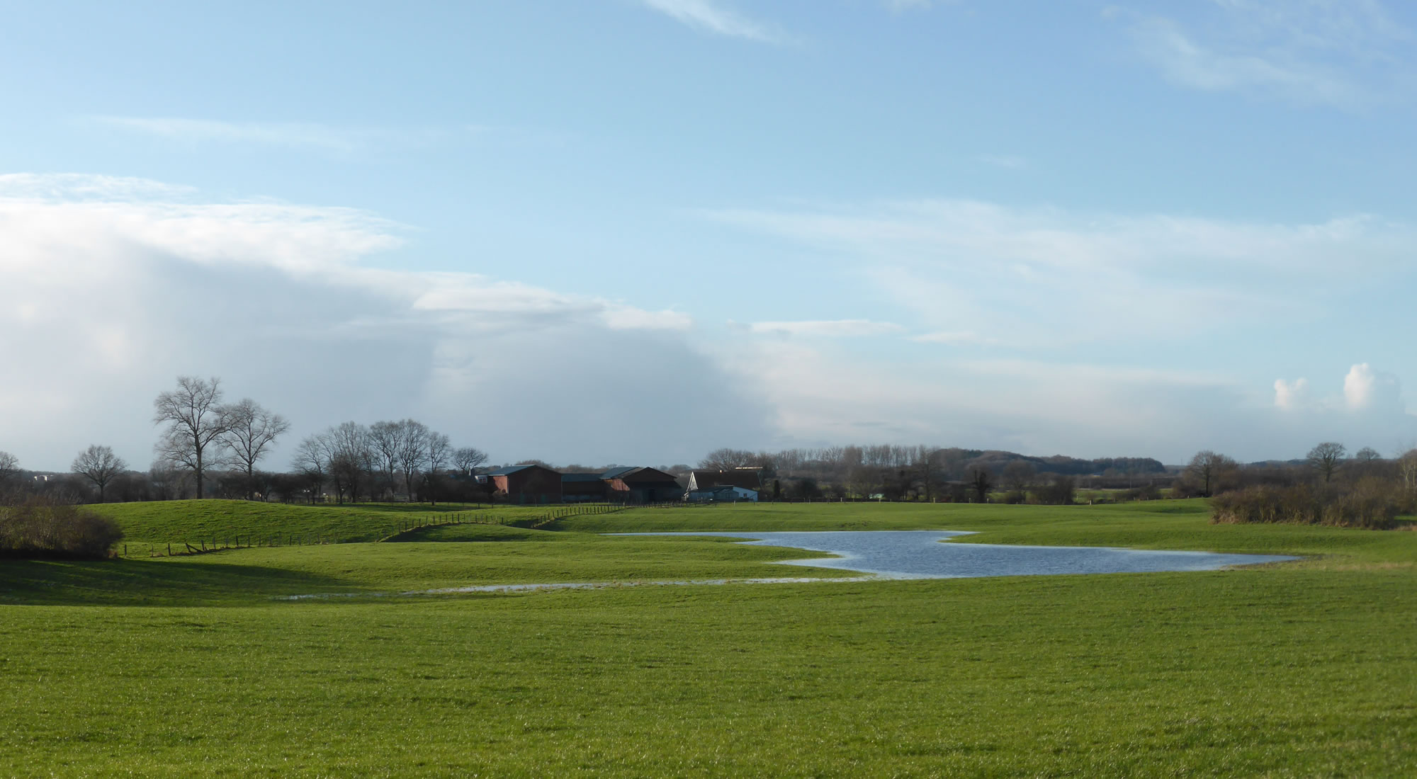 Holstein vun sien schöönste Siet! Dat gifft doch nix Schöners as Wintersünnschien! De Heven is dörsichtig als Glas, dat Loof in de Knicks is weg, de Blick geiht över de Wellen vun't Gelänn wied bit an'e Kimm, un all Feller sünd mit Wintersaat as gröne Sied övertrocken. Man wat du dor sühst, wenn du dör de nakelten Knicks schuulst, dat is hüüt faken: en Seenlandschap, woneem keen henhöört. De Nedderslääg in düssen Harvst weern to veel! Un ok al nu gaht Ambosswulken feern över den Horizont. Jichenswoneem regent da. Schuer-Romantik!