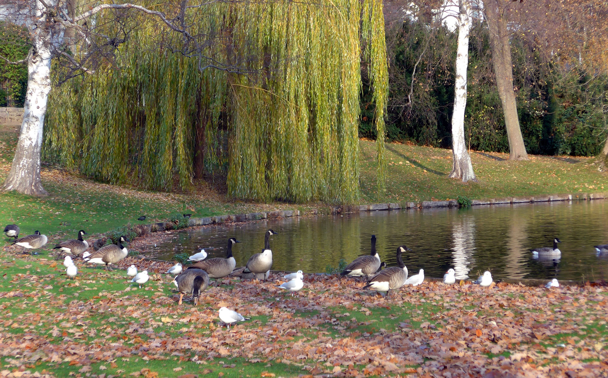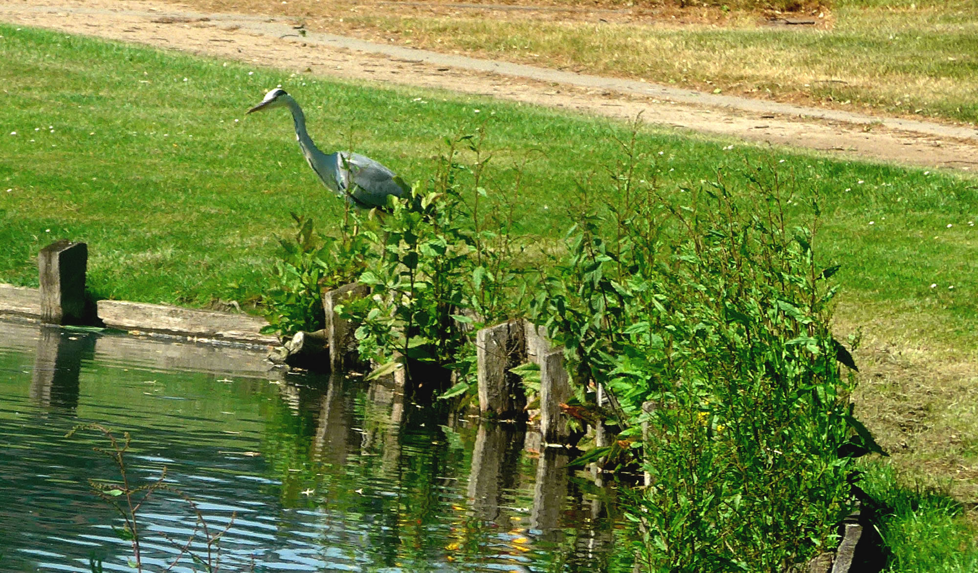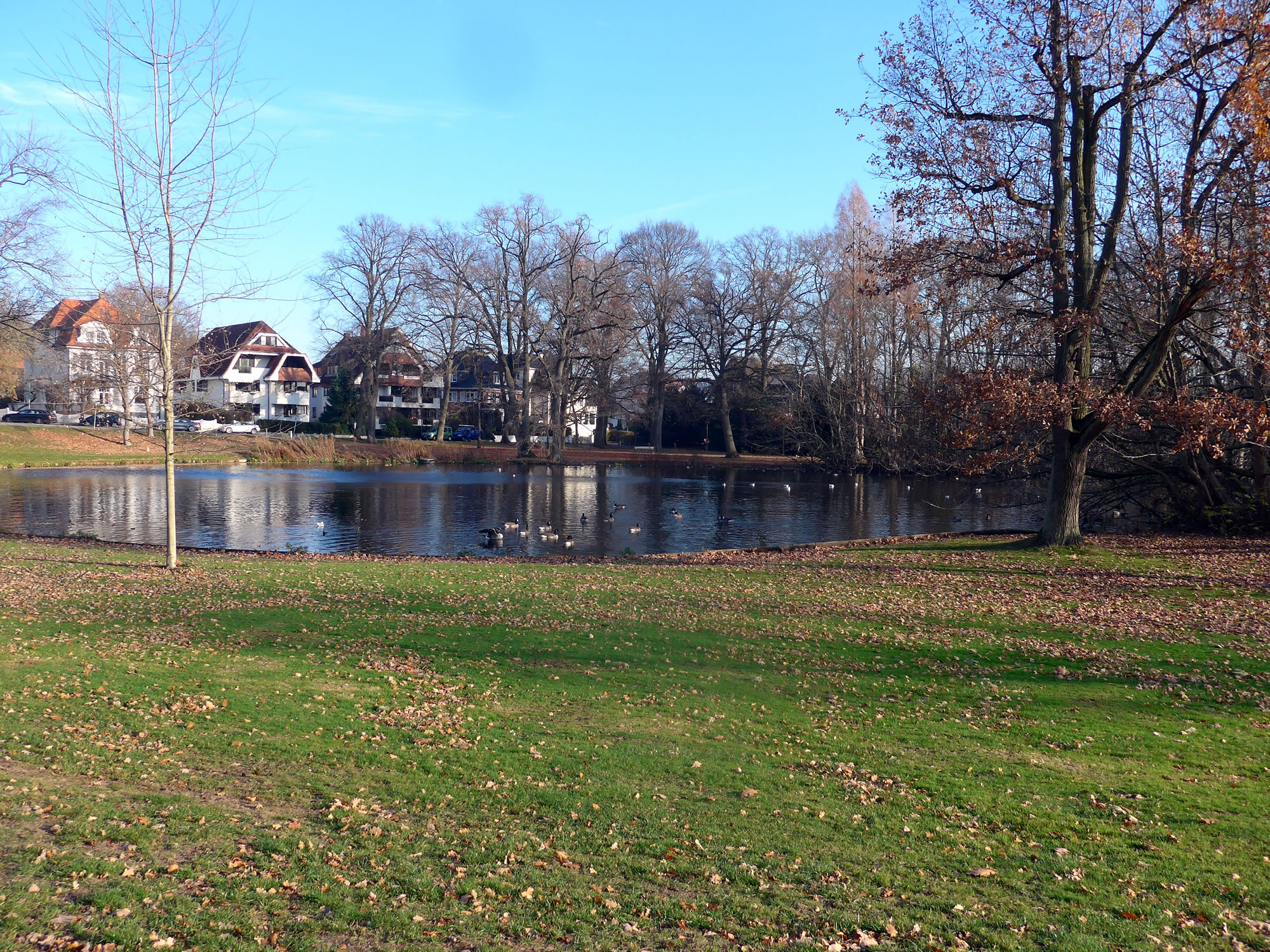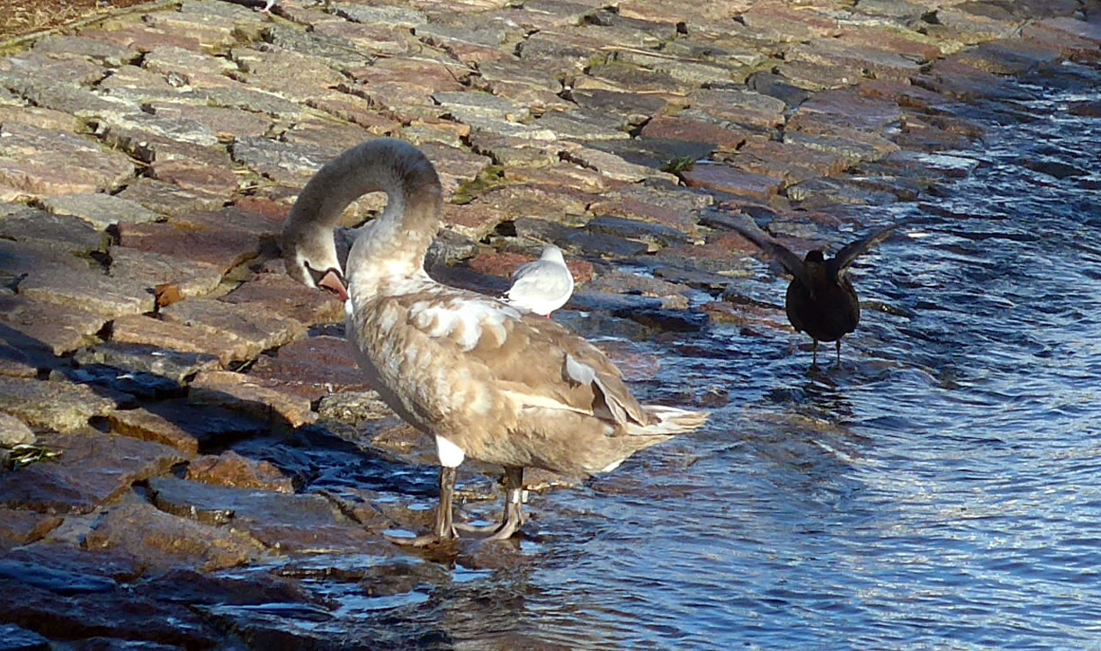 över uns Köpp. Ünner uns Water harr de Aalbek noog. Dor müss sogoor en niege Stratenbrüüch buut warrn. De Verbinnung vun de Aalbek mit den Fischereehaven na de Oostsee geev dat ümmer noch. So müssen wi den Footweg vun den Parkplacken na den Vagelpark inslaan. Geschrei vun de verscheden Vagels ut alle Welt weer al wiet to höörn. De Biller köönt Se per Klick
