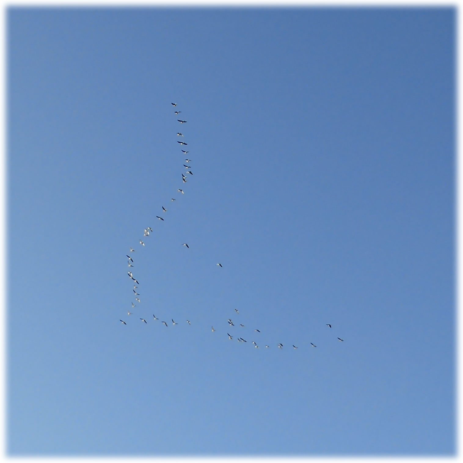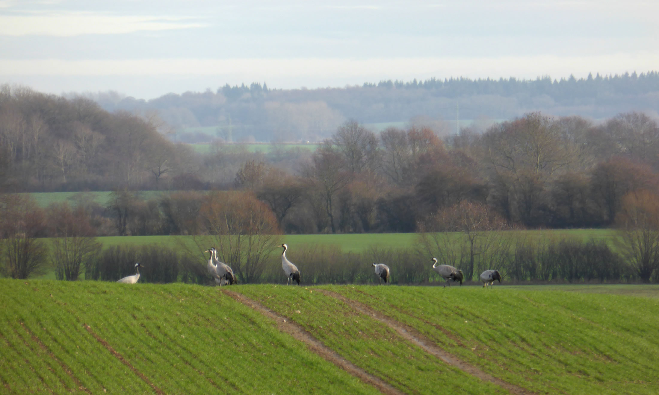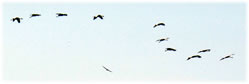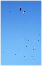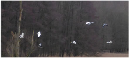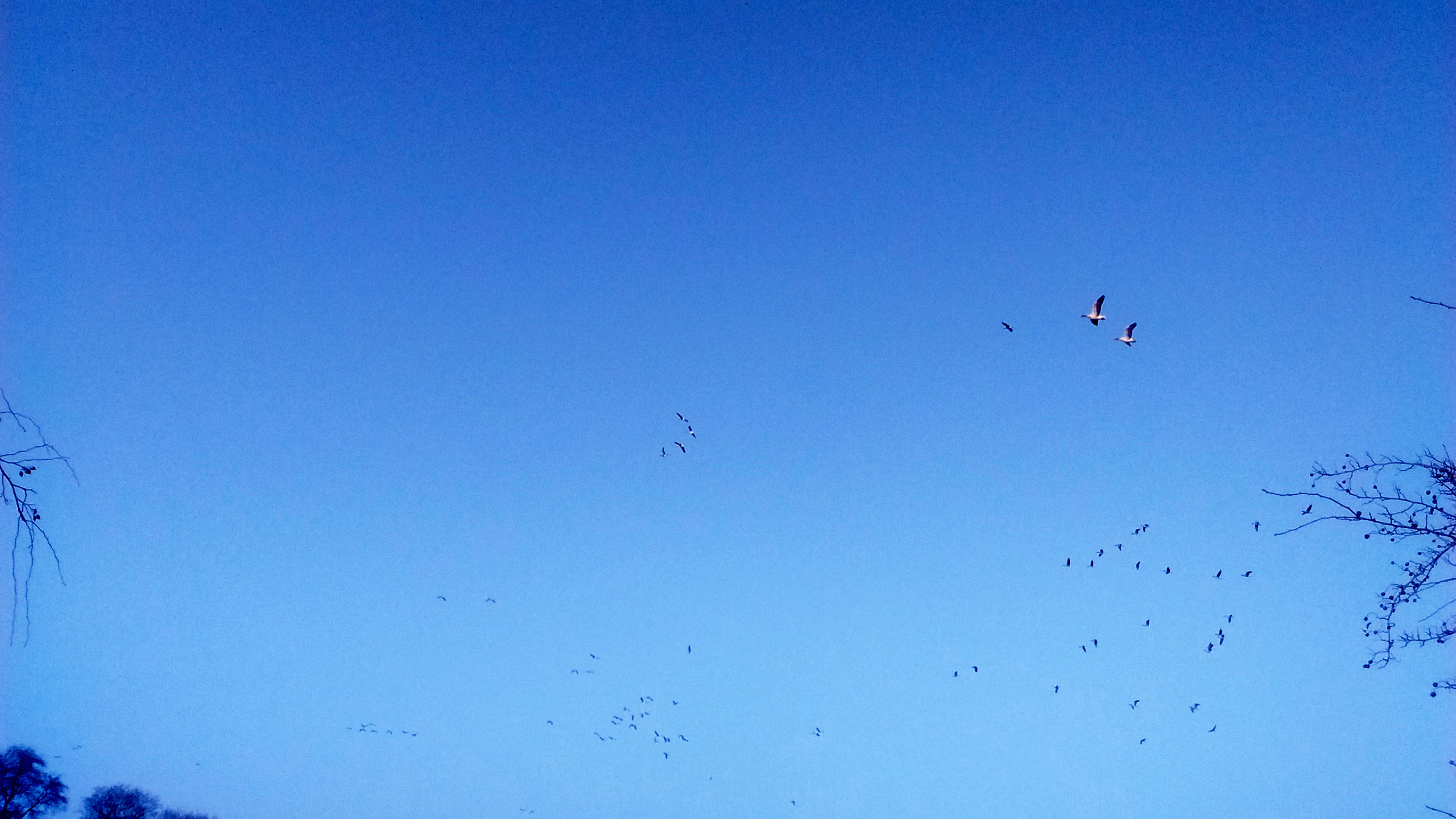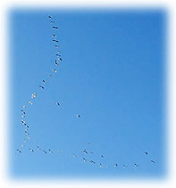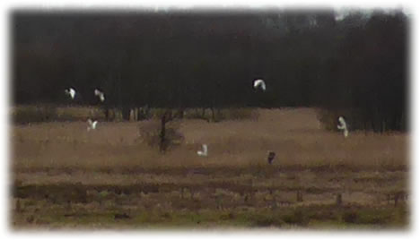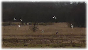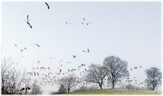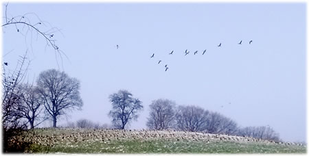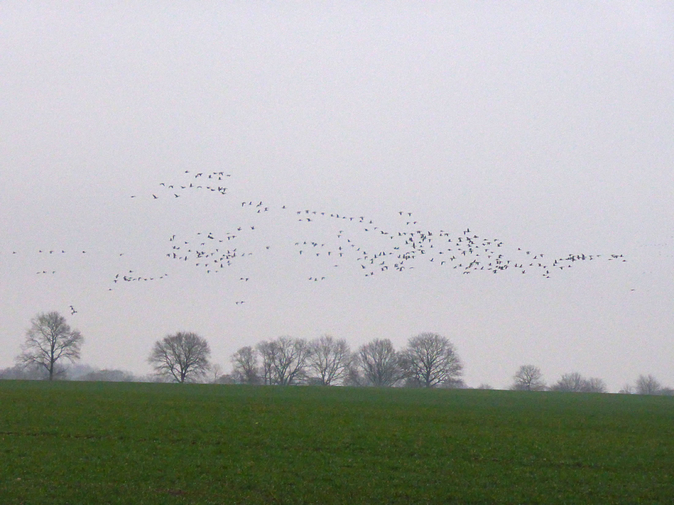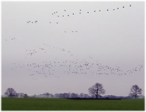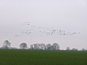 .... In de Neegde vun Hornsmühlen fulln mi gistern opmaal grote Vagelswarms op. Dat weern keen Toogvagels op ehr Reis; dat sehg ut, as weern se bi to öven. Se nehmen Kielform an un lösen sik denn wedder op, störten dal un stegen wedder op, krüüzen en annern Swarm un küseln en Stoot üm den, denn lösen se sik wedder ... un allens jümmer över düsse Ackerflächen! Mi düch, de Vagels müssen vun de Grött her sowat as Wildaanten ween; avers Wildaanten maakt nich solk Toogvagel-Öven un bildt keen Kiels. För de groten Göös-Aarten schienen se mi to lütt, ehr Flünken lepen ok mehr so spitz to. Betere Fotos heff ik avers nich henkregen. Welk Vagelaart mag dat woll ween? De Biller köönt Se per Klick