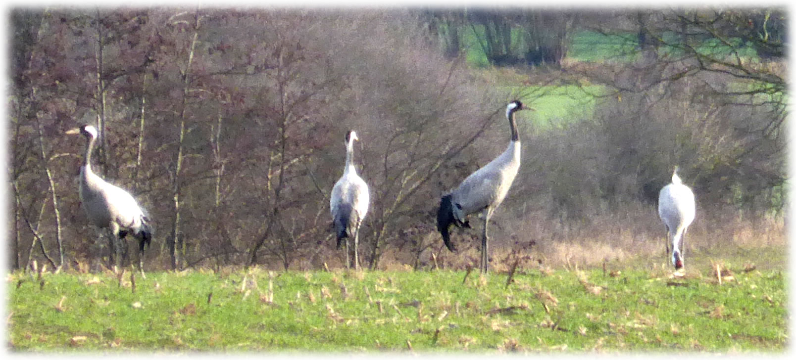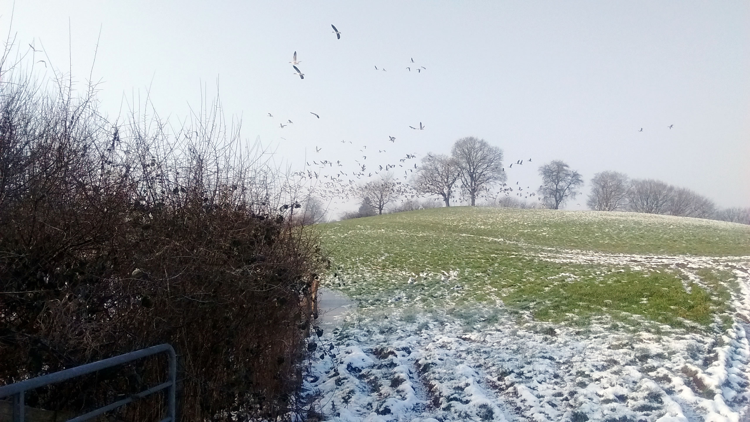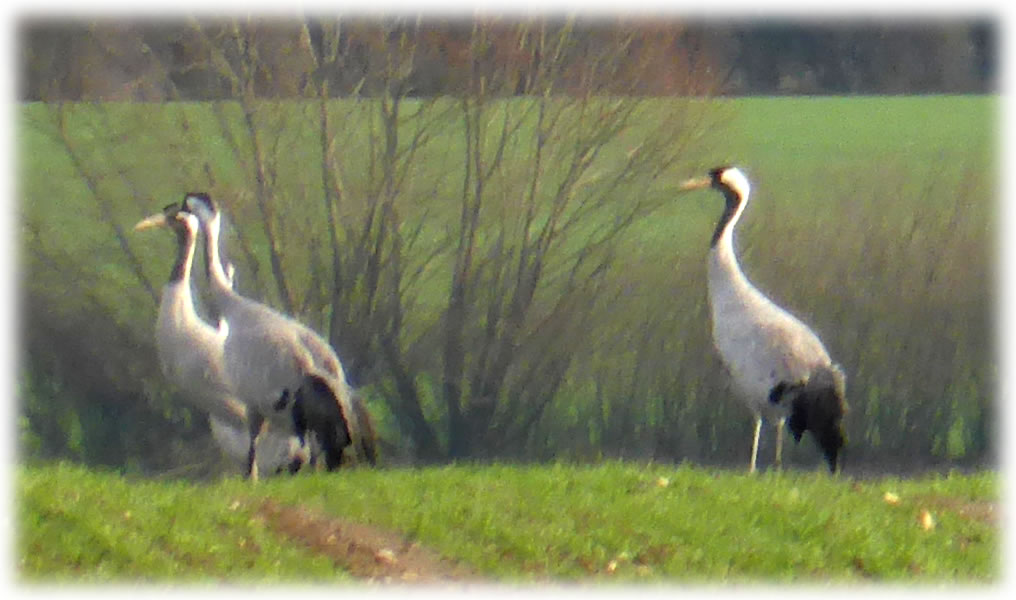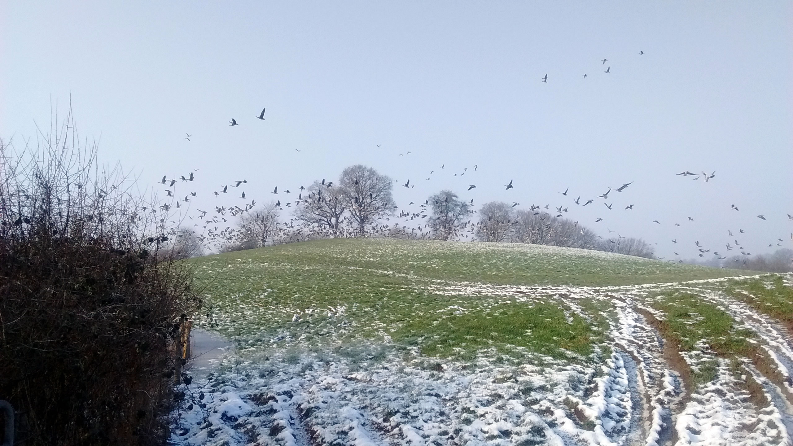 Ik harr mien Fotoapparaat nich to Hand, as ik güstern an düsse Wisch bi Plön vörbikeem. De Dag weer wunnerschöön. Över mi seil en lütte Kiel Wildgöös, ik folg ehr mit de Ogen, un süh, de Wisch, woneem se landen dään, weer merkwördig sprenkelt: Wildgöös, hunnerte, dusende Wildgöös seten dor al! Un jümmers noch kemen welk dorto! Mien Fotos hebbt nu leider bloots Handy-Qualität, avers kunnst düütlich sehn, dat dat Griese Göös weern sünnerlich in'n Floog. Dat kunn keen Göösvolk ween, dat hier överwintert harr, dorför weern dat to vele; ik bün vermoden, de Göös sünd al wedder op ehrn Fröhjohrstoog, un stückerwat Töög harrn sik hier drapen. Denn sünd se ja al Baden vun'n Lent! Bang sünd düsse Deerten ja nich so licht, man as ik neger un neger ran wull, flögen se doch alltohoopen op en Bild as ut Hitchcocks Film un dreihn wraaksüchtig Krinken över mi. Ik bün utneiht.