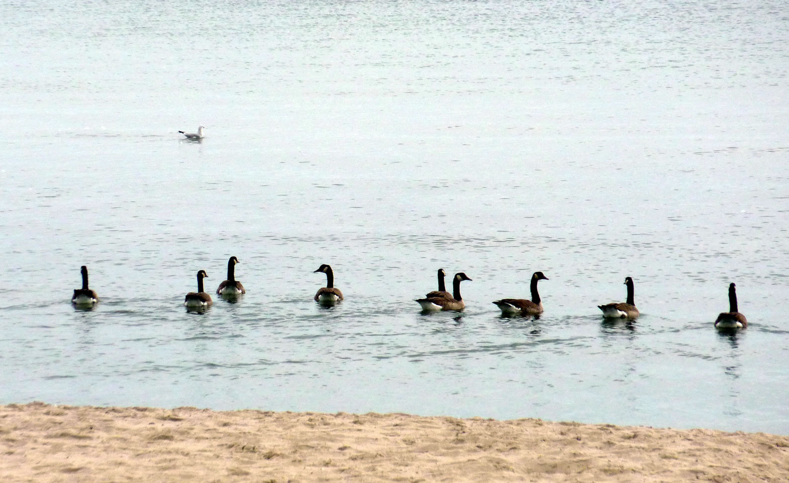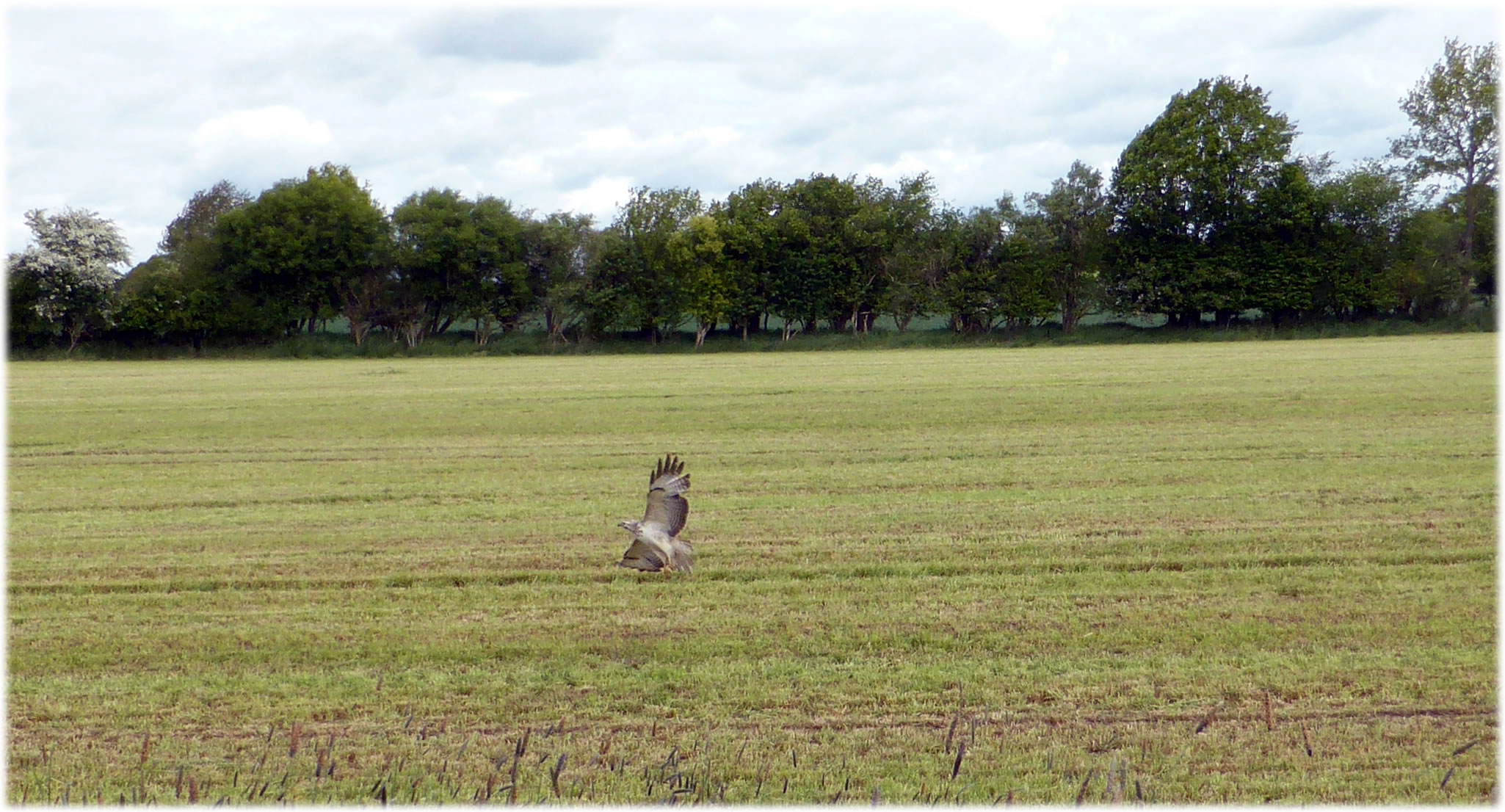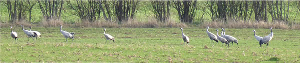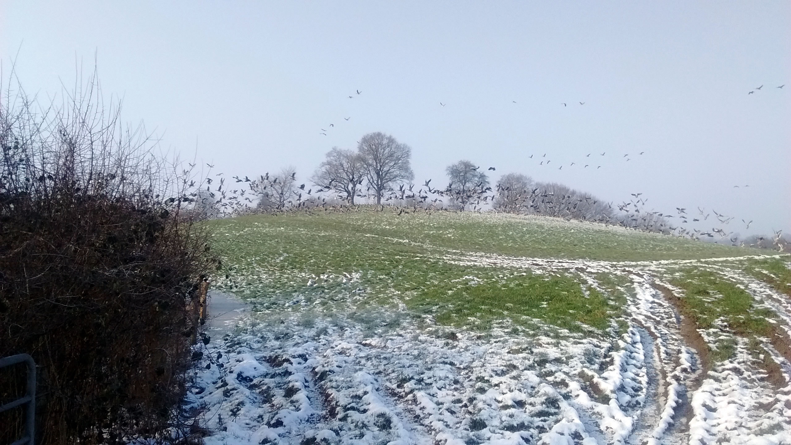 Ik harr mien Fotoapparaat nich to Hand, as ik güstern an düsse Wisch bi Plön vörbikeem. De Dag weer wunnerschöön. Över mi seil en lütte Kiel Wildgöös, ik folg ehr mit de Ogen, un süh, de Wisch, woneem se landen dään, weer merkwördig sprenkelt: Wildgöös, hunnerte, dusende Wildgöös seten dor al! Un jümmers noch kemen welk dorto! Mien Fotos hebbt nu leider bloots Handy-Qualität, avers kunnst düütlich sehn, dat dat Griese Göös weern sünnerlich in'n Floog. Dat kunn keen Göösvolk ween, dat hier överwintert harr, dorför weern dat to vele; ik bün vermoden, de Göös sünd al wedder op ehrn Fröhjohrstoog, un stückerwat Töög harrn sik hier drapen. Denn sünd se ja al Baden vun'n Lent! Bang sünd düsse Deerten ja nich so licht, man as ik neger un neger ran wull, flögen se doch alltohoopen op en Bild as ut Hitchcocks Film un dreihn wraaksüchtig Krinken över mi. Ik bün utneiht.