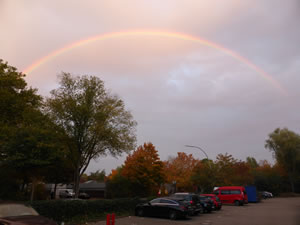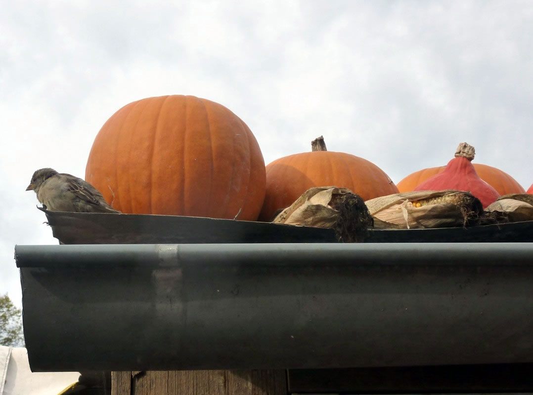 Up den Nahuusweg hebbt wi in de Goorns noch grote Kürbis sehn. De lüchen mit de Sünn üm de Wett. Dat weer wat för Halloween. Dankbor sünd wi an dat Oorndankfest in de Kark gah'n un hebbt vun uns Schätz ut Meckelnborg noch holpen, de Kark to smücken. De Biller köönt Se per Klick