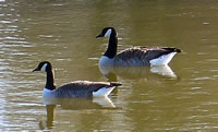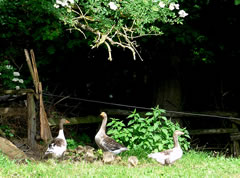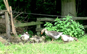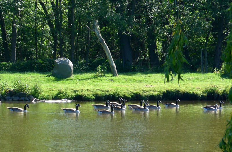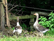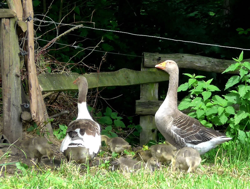 na Nu föhrt wi eerstmal na den Hoff Schimmel. Kort vör den Leonorenwoold stünn dat smucke Schild: "Imkerei Schimmel". Ob de mi wull noch kennt? Vör söss Johr weer ik dat letzt Mal op den Hoff. Seker harr sik dor so Eeniges verännert! Wi wöörn mit luut Gebell vun enen Hund anmellt. Aver denn keem glieks de Fru. "Wie schön, dass Sie einmal wieder zu uns kommen! Wir haben auch wieder kleine Gössel, die können Sie knipsen!" Wat heff ik mi över dat Weddersehn freut! Unsen Weg güng glieks na de Wisch. Dor seten wohrhaftig lütte Gössel mit Vadder un Modder an'n Rand vun den Woold ünner en Flederbeebusch. As se mi wies wöörn, reck Vadder den Kopp hoch un wull mi verjagen. Gau heff ik noch en poor Biller maakt.