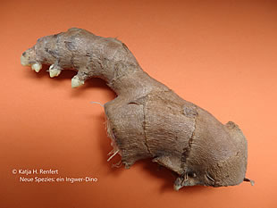 Hier seht Se en Kieferknaken vun Zingiberosaurus Hamburgensis, op Düütsch: de Hamborger Ingwer-Dinosaurier en ganz nieges Fossil, ik heff dat jüst in mien Köök opfunnen! Düsse Saurier is nich besünners groot, avers heel würzig. Goden Aptiet! Dat Bild köönt