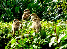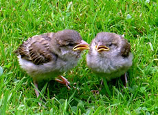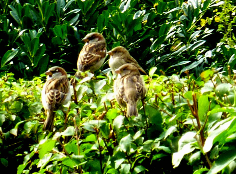 De weern seker ut ehr Nest fullen. Se kunnen noch nich richtig up de dünnen Been stahn. De Ogen harrn se to. Se lehnen sik aneenanner un geven sik Stütt, so good dat güng. Mit eens möken beide de Ogen up. Ehr Moder keem mit Foder! Glieks höör dat Tschilpen up. Moder harr ehr nich verlaten, ok buten dat Nest nich! Ik kunn beruhigt in't Huus gahn. Na mien Meddagsslaap weer mien ersten Gang in Goorn. Dat Tschilpen harr uphört, dat Fedderknüdel weer nich mehr to sehn. Hoffentlich weern de beiden lütten Lünken in Sekerheit! In de Naverschap gifft dat leider veel Katten! De Biller köönt Se per Klick