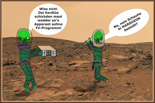 26.7.20 ....High Noon op'n Mars Dat warrt drang op den Mars. Opstunns staht de Planeten Eer un Mars so, dat de Floog na'n Mars nicht so lang is as normaal. Ok dorwegen geiht jüst de Post af. Wi verfolgt hier de InSicht-Missioon, dat is de niegste Sonde, de opstunns dor meten deit, un de Neiwind-Missioon, de al siet 2012 op'n Mars rümmersuust. Man in de verleden Maanden sünd glatt twee niege Sonden op de Reis gahn, de chineesche Tianwen- und de araavsche Al-Amal-Sonde. Un opneegst (plaant is de 30. Juli) start noch een vun de USA en Nafolger för Neiwind. He hett ok en lütte Helikopter an Bord, de versöken schall, in de heel dünne Marsatmosphäre nich mit Düsen, sünnern mit en Rotor to flegen. Dat is ja allens heel intressant, un wi warrt de Missioonen wisslich hier wiederverfolgen, wenn se landt un wat rutkriegt in rund 7 Maanden (so lang duert de Floog na'n Mars opstunns) köönt Se dat hier op Platt lesen. Avers is de Mars wirklich dat Teel? Orr is dat bloots dat Speelfeld för Techniktests un Sülvstdarstellen? Will jedereen, de wat op sik höllt, en Foot op'n Mars hebben? Wenn de sik dor in't Geheeg kaamt, wenn sik dor opletzt noch de Roboters Slachten levert wat seggt denn uns Marsianers? Marlou Lessing, Bild Ludgerd Lüske