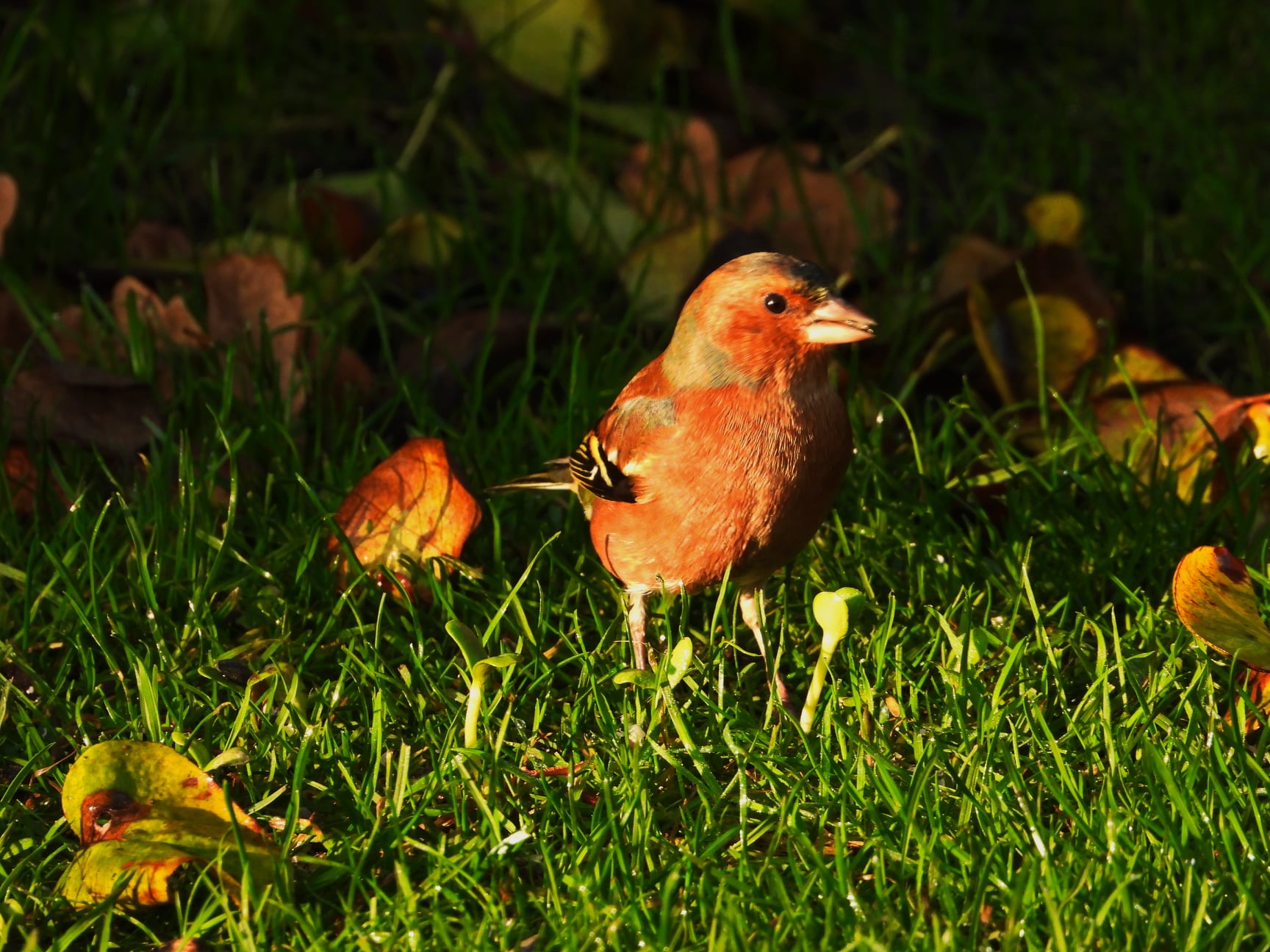 8.11.20 ....De Bookfink as Goorner Oha!, denkt Kalli Bookfink, dor wasst ja lütte Kiens vun Sünnenblomen ut de Eer! Dat sünd de Sünnenblomenkeerns vun't Vagelfoder, de ik översehn heff! Wat heff ik mi argert, as ik de rünnerfullen Keerns nich faatkregen heff un nu gifft dat hier neegsten Harvst en ganze Sünnenbloom vull Keerns, Hunnerte! All Vagels hebbt dor wat vun. Un eentlich heff ik de plant. Hach, ik bün schon geniaal... Dat Bild köönt