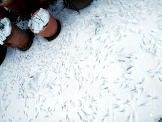 Wat weer dat buten för'n Larm? Dat höör sik an, as wenn Snee rüümt wöör. Un wohrhaftig, achter den Vörhang kunn ik den Snee sehn. Un dat sneet ümmer noch. De Flocken wirbeln dörcheenanner. Sehg smuck ut. Dat Vgelhuus harr al en dicke witte Deek översmeten.