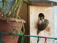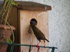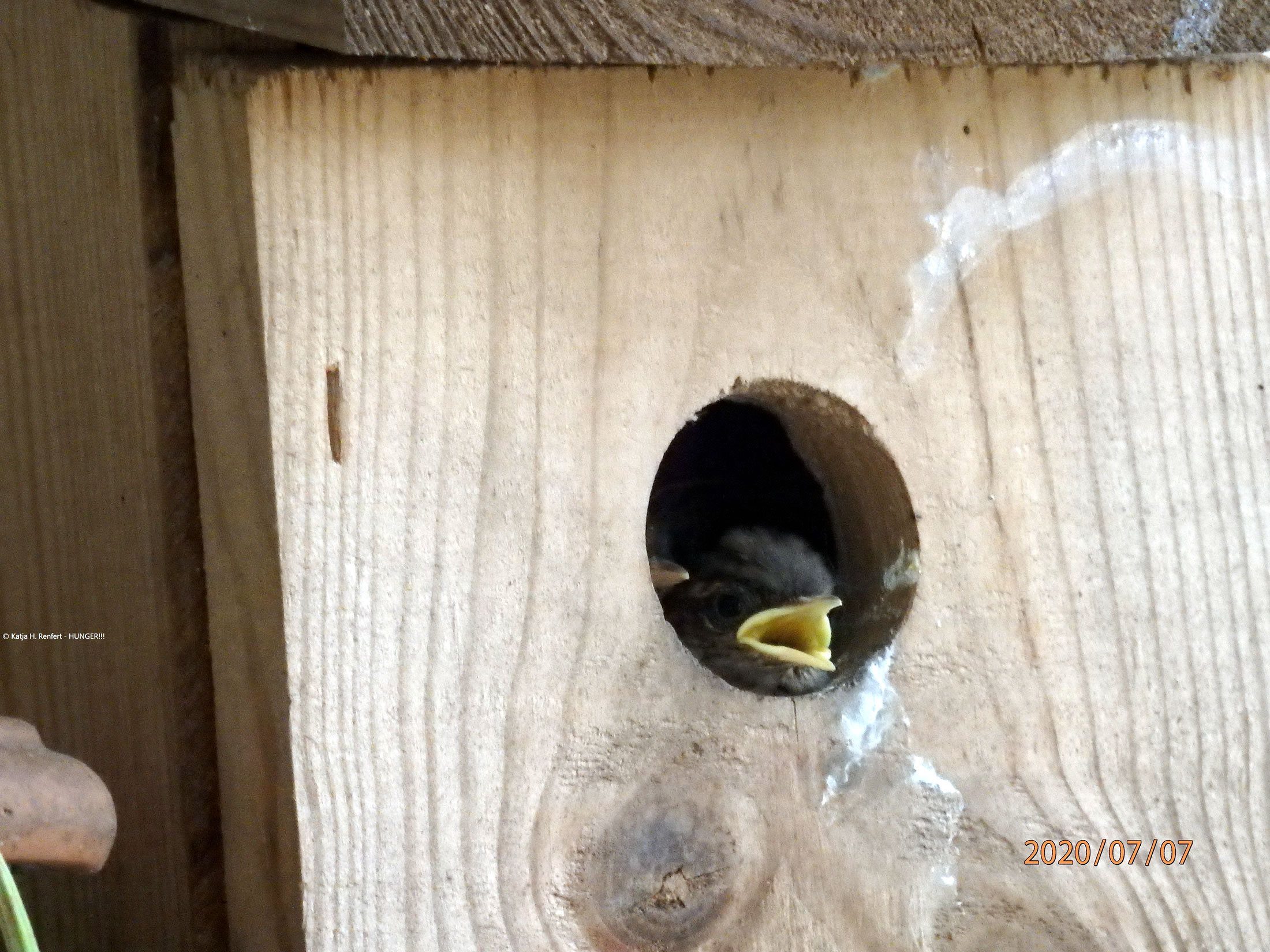 Na Weken un Weken, de ik dat Vagelhuus bi to beobachten weer, weer nu endlich sichtbore Nawuss vördag kamen. De Lütten hebbt natüürlich in eensento Hunger, schriegt avers nich na Foder, as ik dacht heff. Wenn Moder Foder bringt, stoppt se nich bloots de hungrigen Snavels an't Lock, sünnern krüppt ok na binnen. Dorwegen kann ik mi vörstelln, dat dor binnen noch mehr Lütte töövt. Nu kann ik mien Balkon eerstmal nich mehr sülven bruken, un dorna mutt ik wohrschienlich dat Huus opschruven un putzen. Dat is mi dat königliche Beleevnis weert. De Biller köönt Se per Klick