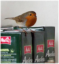 2.3.20 ....Lütt Roodbost kiekt op'n Koffi rin Ik höör dat jichenswo russeln un denk noch, dat is mien Fru aver nee, dat weer wen anners, en lütt Roodbost weer rinflagen! Toeerst seet dat in de Vörraadskamer un intresseer sik apensichtlich orig för den Koffi. Denn büx dat in de Wahnstuuv ut! Ik heff dat Finster wied opmaakt un gaaaanz vörsichtig den lütten Pieper na buten schuucht. De Vagels köönt dat ja nich af, wenn se to veel Stress kriegt, opletzt fallt mi de Buttscher noch in Amidam orr kriggt den Hartslag un tschüß. Nee, dat wull ik nich riskeern wo buten doch dat Fröhjohr op em töövt mit Sünnenschien un siene Leevste jichenswo! Aver för en poor Fotos harr ik Tied. Harr de Kamera jüst to Hand. De Biller köönt Se per Klick