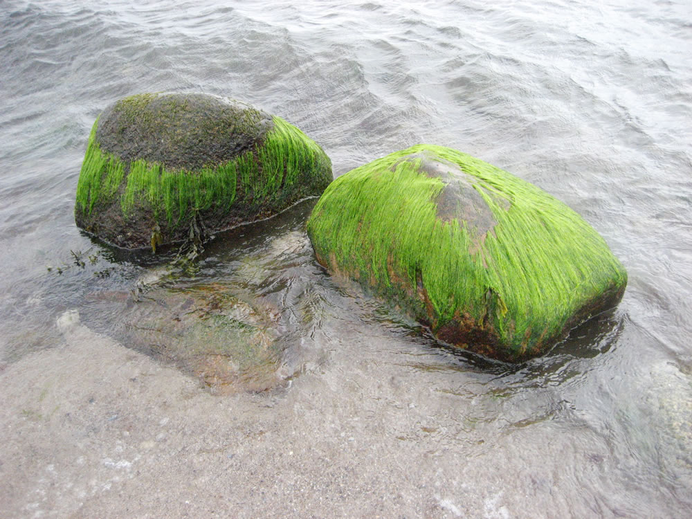 Meist sehg dat ut, as harr en Künstler siene "Werke" in 't Water vun de Ostsee stellt. Hier mal en Steen, dor mal en Steen un all weern övertrocken vun en wunnerfien Gröön. Ik kladder also rünner an 'n Strand un leep dörch den Sand bet an de Waterkant. Dat Gröne weer en Plant. Natüürlich dach ik eerst an Seegras man nee, Seegras weer dat doch wohl nich.
