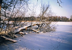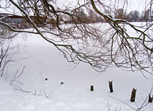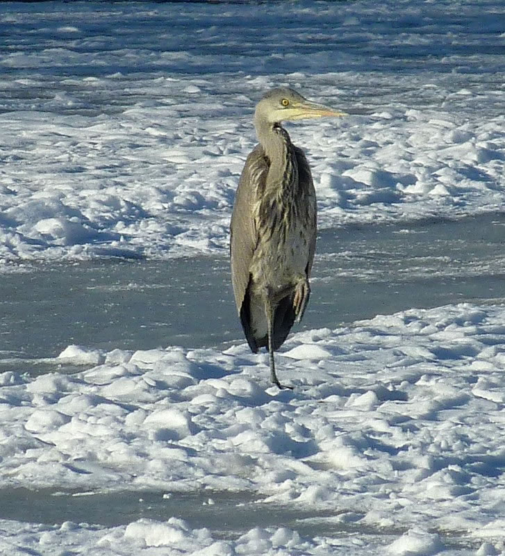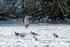 7.2.10 . .Fischreiher up den Karpendiek Düsse Winter harr dat in sik. Alle Dieken weern to. Dat froor Steen un Been. De nakelten Bööm recken sik in Heven un stünnen stief. Wenn de kole Wind dor dörchhuul, knarren un knurren se. Höör sik meist an, as stöhnen se för Küll. Bi dütt Weder wöör ik enen Fischreiher up den Karpendiek wies. He stünn up en Been, meist as so'n Wachsuldaat, meern up den Karpendiek. He ripp un röög sik nich. Keek he villicht in de Runn, up dor en Fisch för em weer? Aver de Karpendiek weer tofroren. Narms weer en Waterlock to sehn. Wi sull he dor an en Fisch kamen? In Sommer hett he sik oftins mit Fisch ut den Diek bedeent. An neegsten Dag keem ik wedder an den Diek vörbi. Un wedder stünn dor de Fischreiher, meist up den glieken Placken. Möven luren ok op dat Ies vun den Diek. Welk seten to den Fischreiher sien Fööt. Sehg meist ut, as wulln se em Sellschop leisten. Düttmal harr ik mien Knipskassen bi mi. Ik kunn mi teemlich dicht an den Reiher ranslikern. He beluur mi aver un keek mit sien scharpen Ogen ümmer rundüm. Denn böör he sien Flünken an un flöög hoch. He dreih twee Runnen un lann dorna wedder up dat Ies. Jedeenmal wenn ik an den Diek vörbikaam, kiek ik na em ut. Ümmer wedder steiht he up dat Ies un luurt. Wolang he dütt Speelwark wull ahn Fisch dörchhöllt? Villicht sull ik em welk köpen. Dat hebbt wull ok anner Minschen dacht. Twee Daag later weer ik wedder an den Karpendiek. Dor harr ener en Lock för den Fischreiher in't Ies haut. Nu stünn he an dat Waterlock un luur up Fisch. Wüllt höpen, dat he dor en Fisch finnt. De Biller köönt Se per Klick