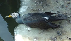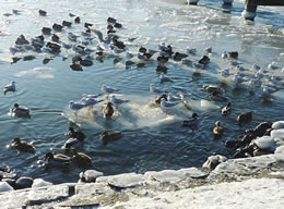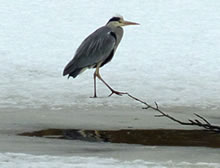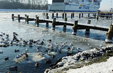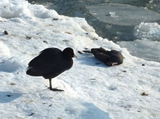 breekt de Iesschollen uteenanner. De annern Watervagels müssen an de Kant stahn blieven un töven, bit de neegst Iesscholl sik lööst harr. De Biller köönt Se per Klick
