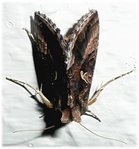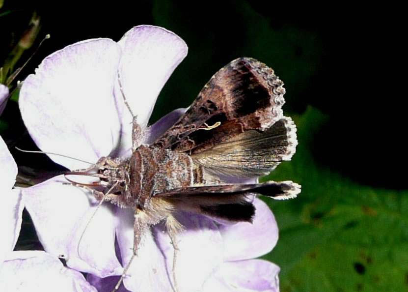 An'n Avend heff ik al oftins Nachtulen in mien Blomenbeet andrapen. Keen Nachtuul in Minschengestalt! Dat weern Nachtfalter, so nöömte Gamma-Ulen. Se flattern so unruhig vun Bloom to Bloom, dat ik keen Schangs harr, se to knipsen. Un hüüt, na den groten Regen, geev dat över Meddag n' beten Sünnenschien. Dat hett veel Insekten rutlockt. Se flögen in mien Goorn üm de Blomen. Un ok en Nachtuul, en Gammauul weer ünnerwegens.