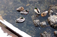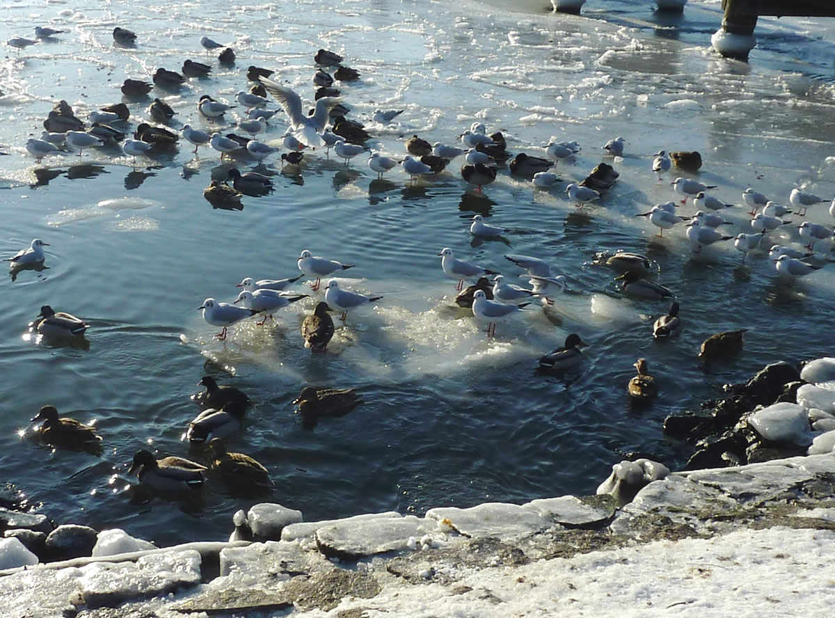 To lang duurt düsse Winter. Nich blots uns lütten Singvagels liedt Noot. Ok de Watervagels findt to wenig Freten. Up mien Spazeergang an dat Över vun de Trav heff ik veel verhungert Watervagels in Snee liggen sehn. Welk weern al storven, de annern legen halv doot up dat Ies. Weern mank de Iesschollen inklemmt un fastfroren. An't Över geev dat en Reeg Foderstellen. Dor weer denn en groot Drängelee. Besünners veel Zappis weern dor to Stell. Aver ok Möven, Aanten un Swaans weern dormang. De Zappis weern deelwies al so maddelig, dat se dat Foder in Liggen uppicken. An Rand vun de Trav un mitünner ok meern mank de velen Vagels legen verhungerte Zappen. Dor möken sik de Möven överher. Veel rode Placken up dat Ies wiesen dat Enn vun en Watervagel.