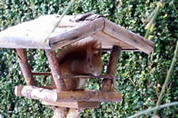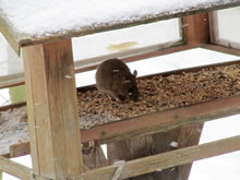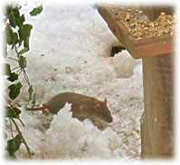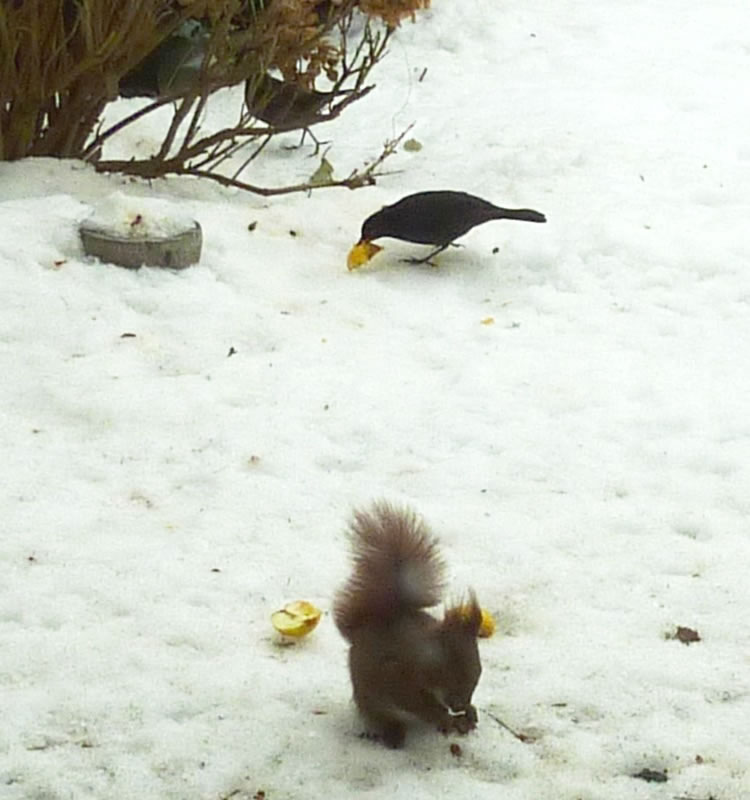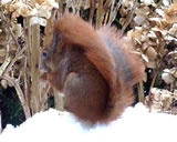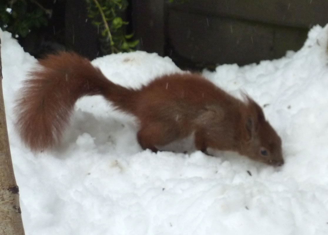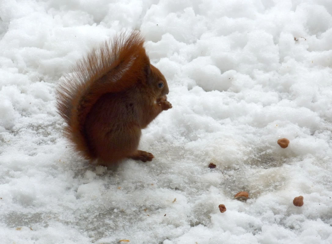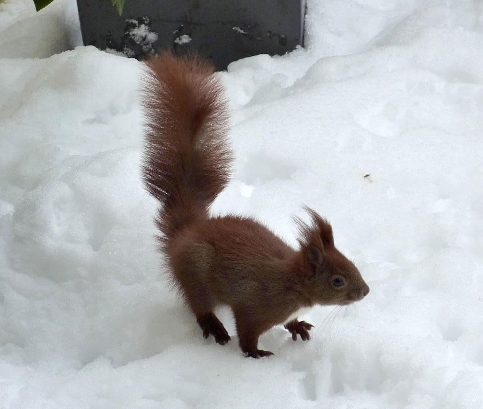 Flink huusch Jan Flink vun Busch to Busch. Mitünner müss he över den hogen Snee. De lütten Fööt saken deep in den weken Snee. En breed Spoor bleev trüch. In't Vagelhuus harrn de Vagels allerhand för em nalaten. Un up de Terrass legen noch grote Stücken vun Appels. De smeckten Jan Flink besünner goot. Mit en groot Stück Appel hau he af in den neegsten Boom. Dor hett he sik den lütten Buuk richtig vullhaut. Annern Dag weer he wedder to Stell. Den buschigen Steert as warme Deek över den Rüüch seet he wedder in't Vagekhuus un leet sik dat goot smecken. Mit Höölp vun dat Vagelfoder kann he sien Hunger stillen. So kümmt Jan Flink seker goot över den Winter. De Biller köönt Se per Klick