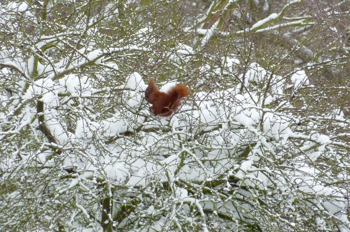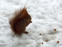He schüttel sik vör Küll. De Telgen vun de Bööm un Büsch in de Goorns weern mit tominnst 20 cm Snee todeckt. Weer gor nich eenfach, de Nööt ünner den Snee uttomaken. De harr he al in Harvst as Vörrat in'n Goorn vergraven.
