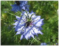 Wat hier so schön blöht, is de "Jungfer im Grünen". Ik mag de Plant lieden. Se ist so fien, un ehre Blöden sind so schöön blaag. Se is veel as Goornplant to sehen, as Bispill in Buurngoorns. Wat mi ok an disse Plant gefallt, sünd ehre hübschen Namen: