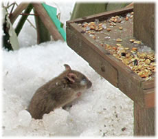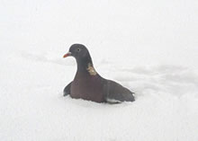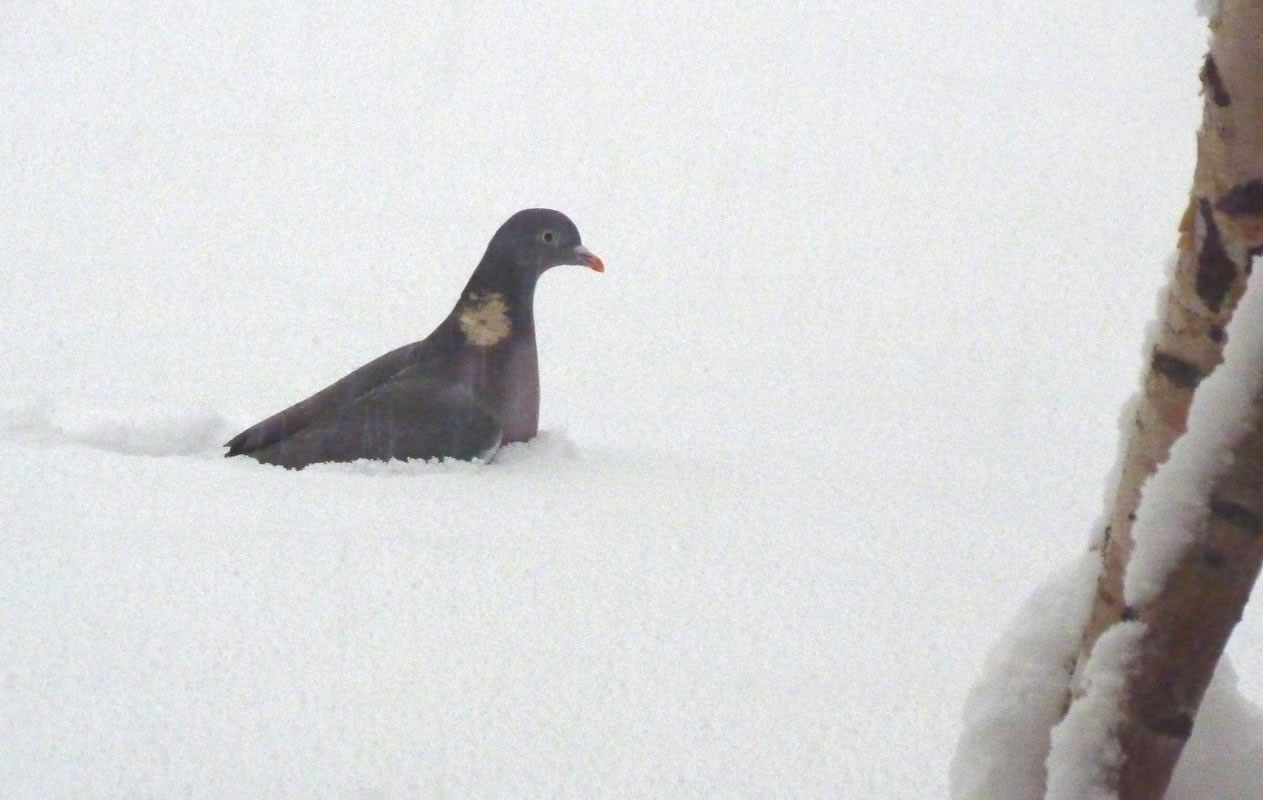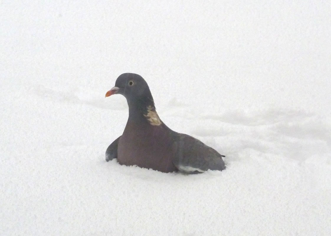 Dat Vagelhuus warrd nich blots vun de lütten Vagels upsöcht. Ok Duven, Heister un Kreien kaamt un söökt na Vagelfoder. De Duuv luurt ümmer up een Telgen. Wenn de Luft rein is, kümmt se dörch den dicken Snee över den Rasen anwackelt. Se is so swoor un behäbig, se versackt in den depen Snee. Dat süht richtig drollig ut. Se lett en brede Spoor trüch. Ünner dat Vagelhuus findt se den de Koorns, de vun de lütten Vagels daalsmeten sünd.