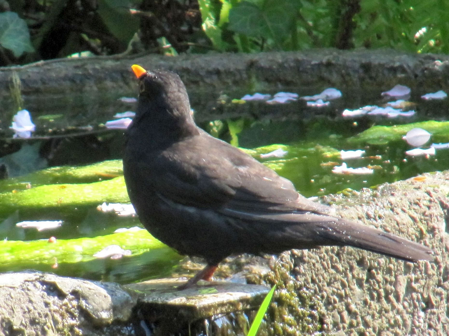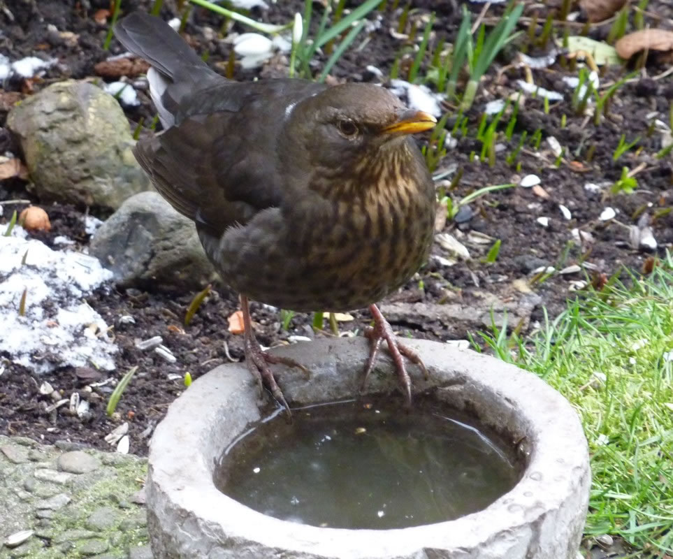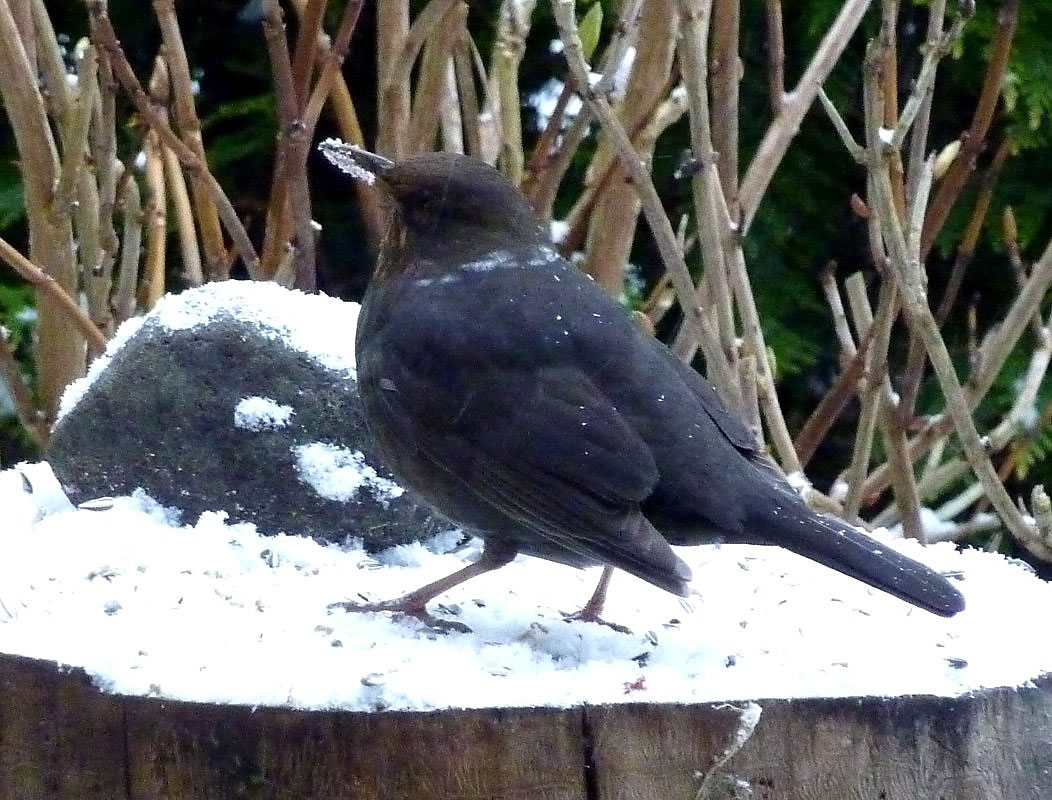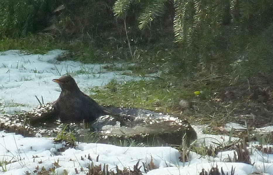 Ik glööv, wi hebbt ok ene Singdrossel üm uns rüm. Ik höör dat Singen, sehn heff ik se noch nich. Man sehn heff ik ehre "Drosselsmeed". Dat is en Steen, up den de Singdrossel Snicken tweihaut, so, as weer't en Amboss. De Vagel nimmt de Snick an de apen Siet in'n Snabel un haut dat Snickenhuus so lang up den Steen, bet dat tweigeiht. "Peng, peng, knack" Also, wenn ik mi dissen Steen mit all de Snickenhuus-Schören üm rüm ankiek, nee, denn stimmt dat wohl nich mit "Dusslige Drosseln". De Biller köönt Se per Klick