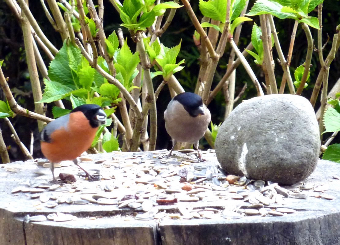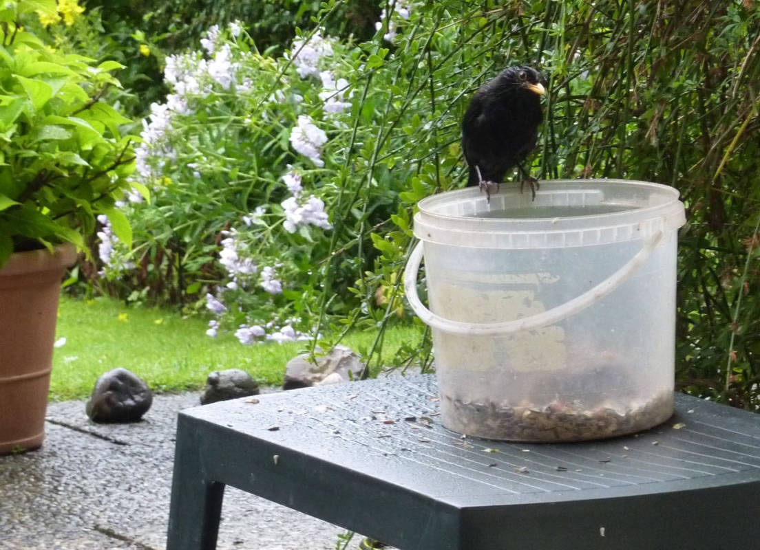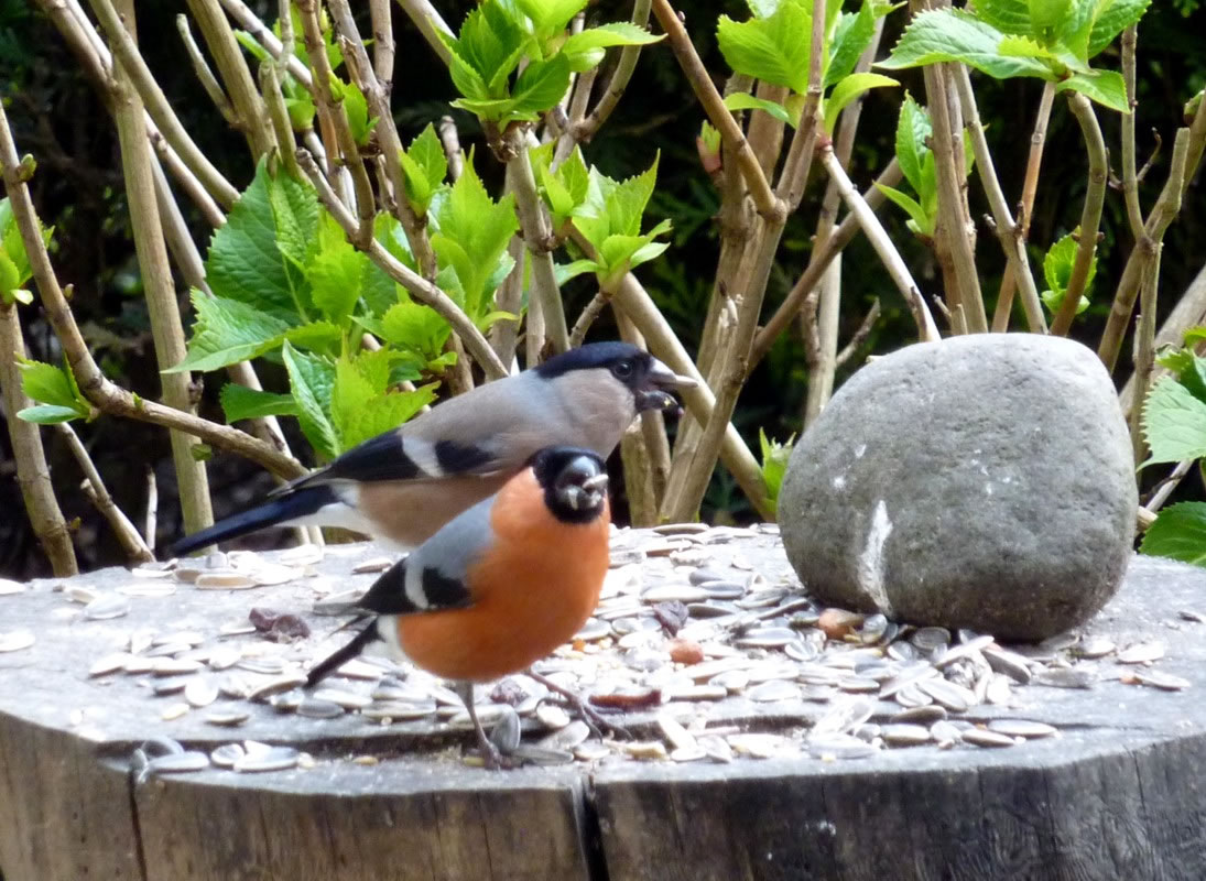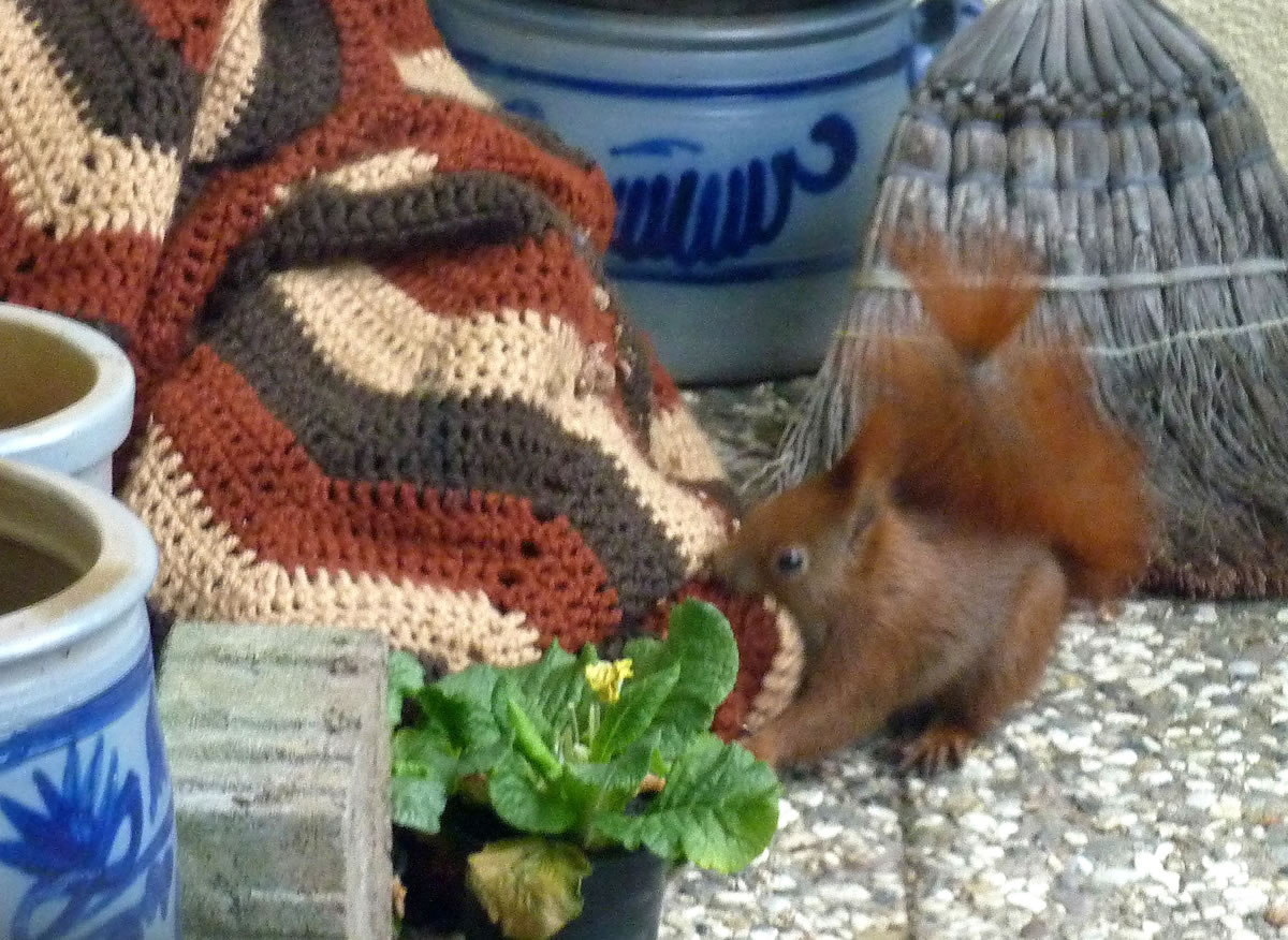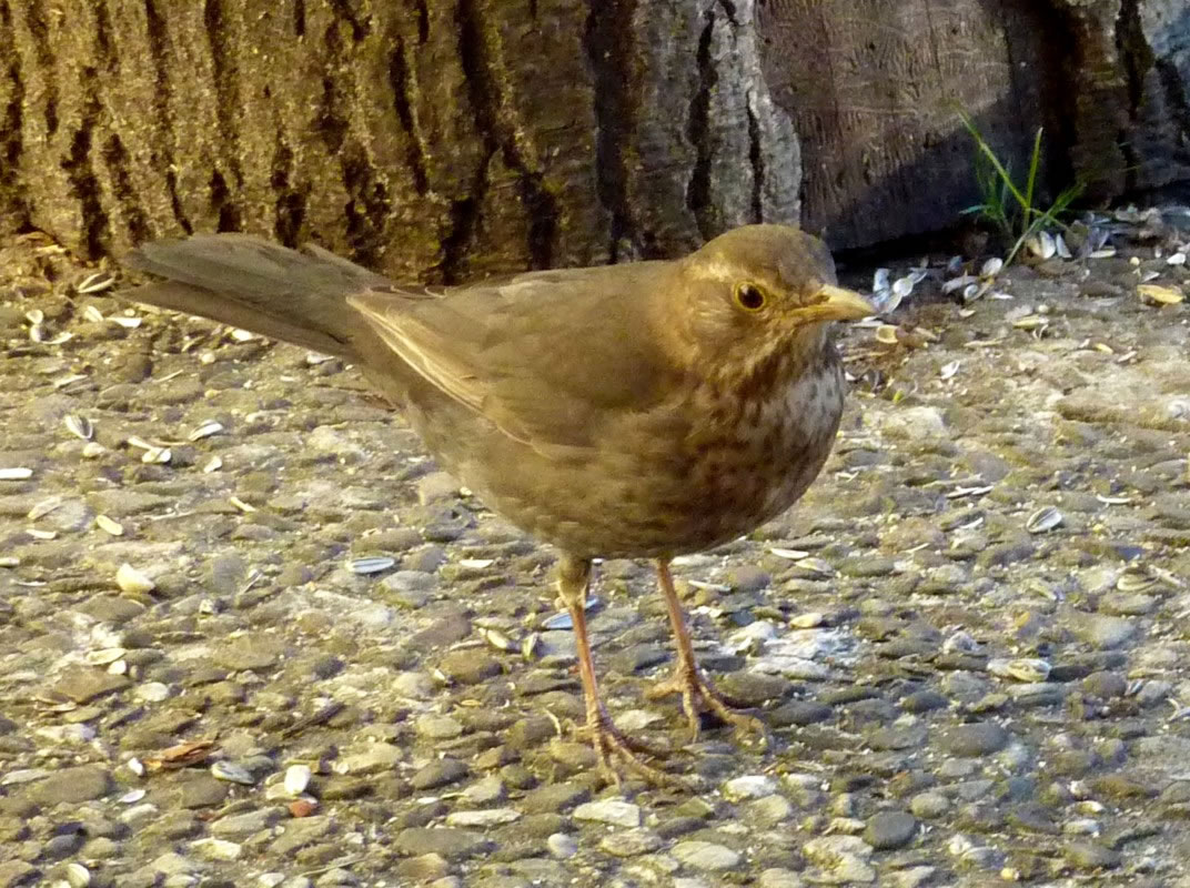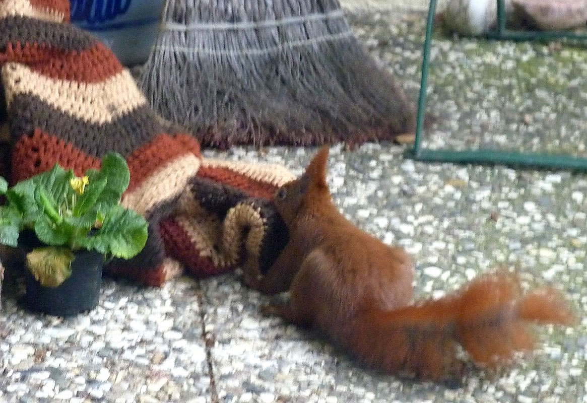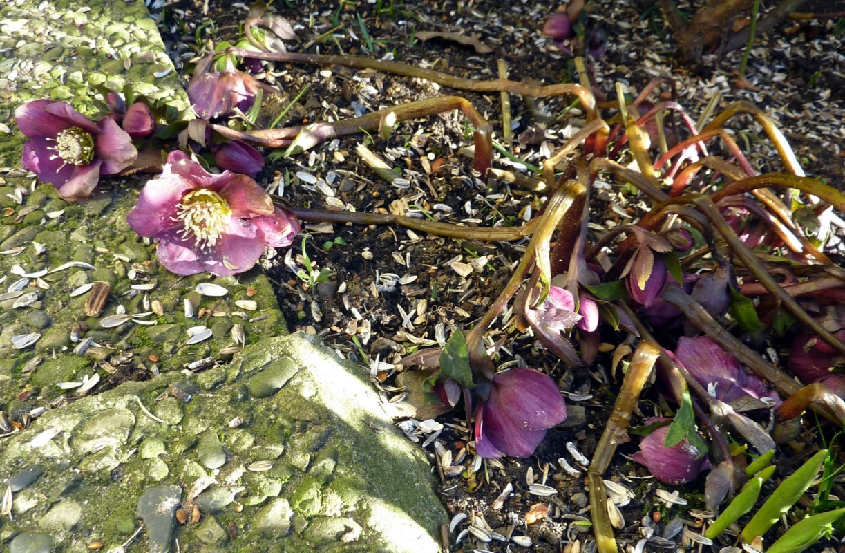Wenn se dat nu ut Hunger daan harrn, denn wörr ik ja nix seggen man direkt dorneven steiht mien leev Mann sien groot "Vagelvilla", de jümmers goot mit Vagelfoder füllt is. Dor köönt se freten, de Drosseln un Kreihen, man doch nich miene Blomenzibbeln ut de Eerd rieten! Nee dat is ganz un gor nich in Ordnung! Ik heff fix mit dat Vagelvolk schimpt.