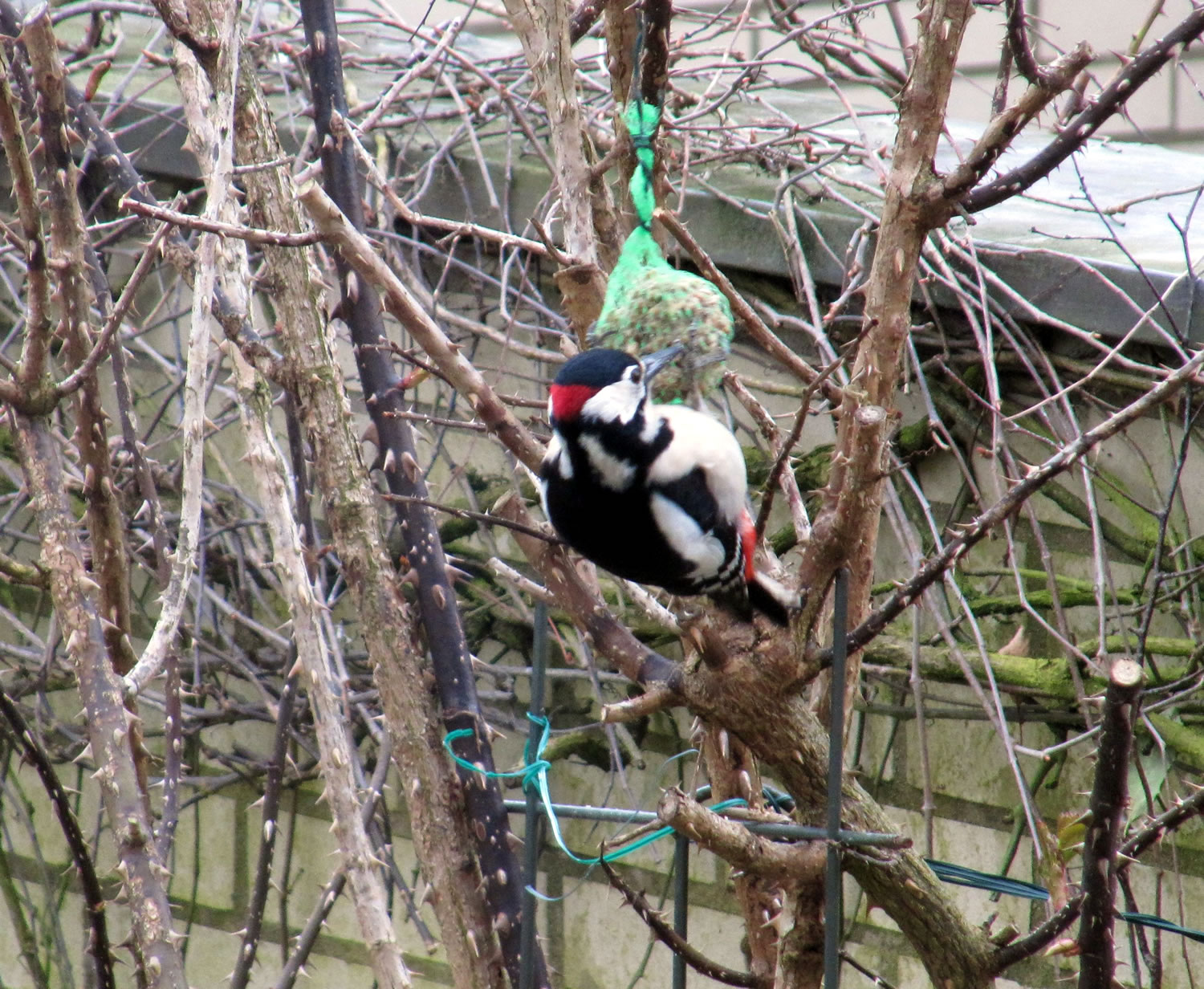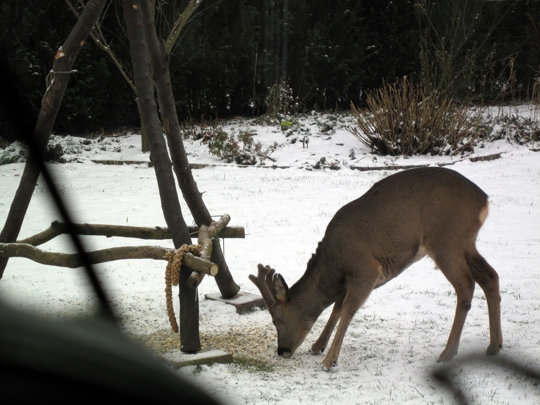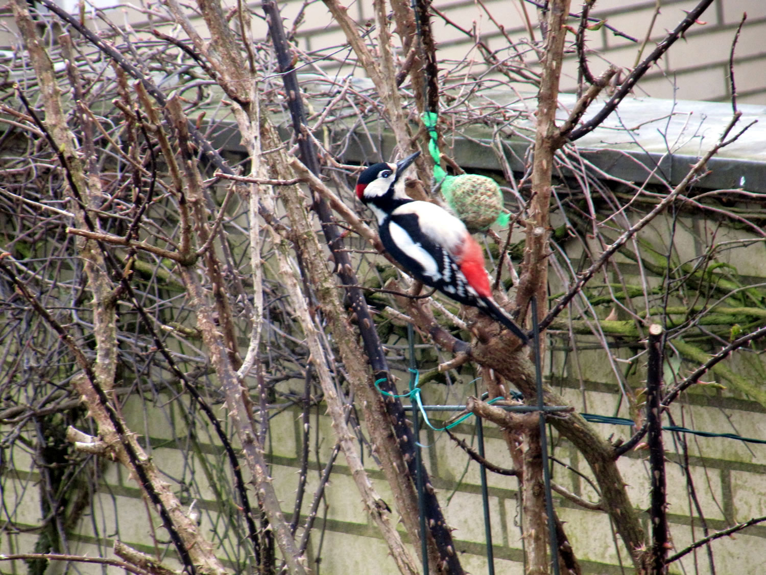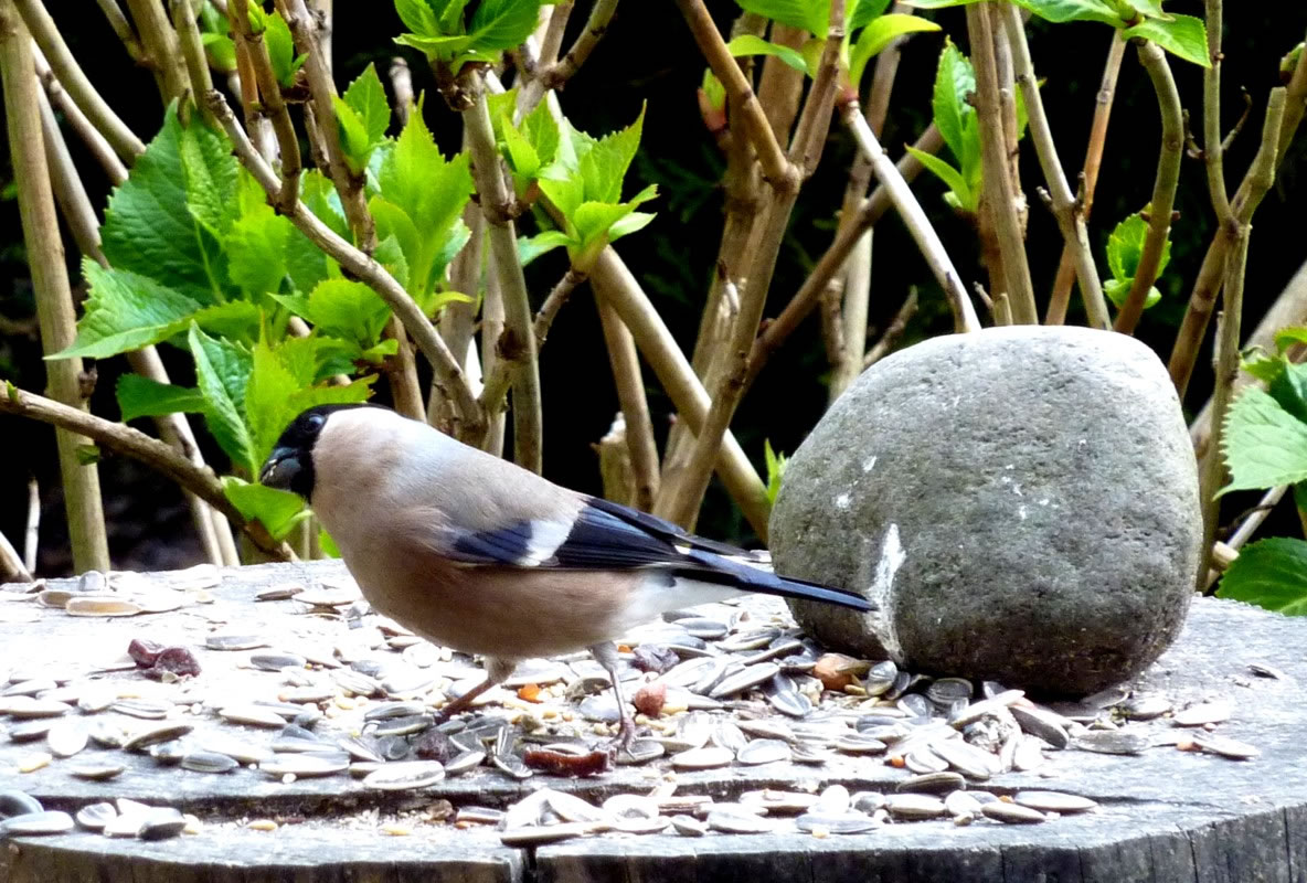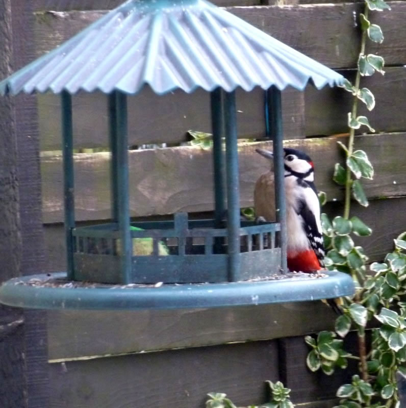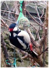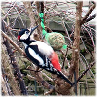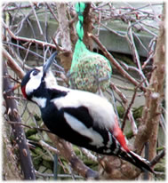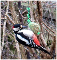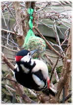 Worüm ok jümmers, se sünd goot to höörn, de Spechte, man to sehn kriggt man dissen Vagel eher selten. Ik aver heff vör poor Daag Glück hatt. En Buntspecht harr sik över den letzten Meisenbüdel hermaakt, den mien leef Mann noch ruthangt harr. He harr dat nich licht mit den Meisenbüdel, de för veel lüttere Vagels maakt weer. Ik kunn em also "infangen". He weer wohl noch en jungen Vagel, denn he harr noch de rode Huuv up'n Kopp. De Biller köönt Se per Klick