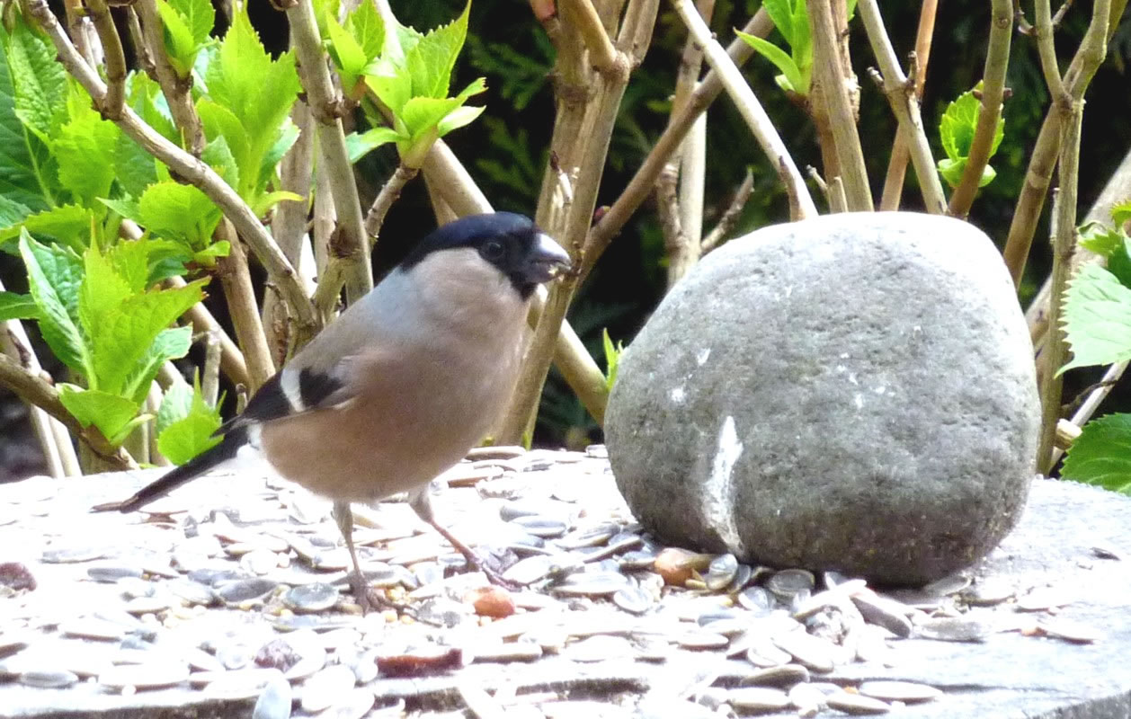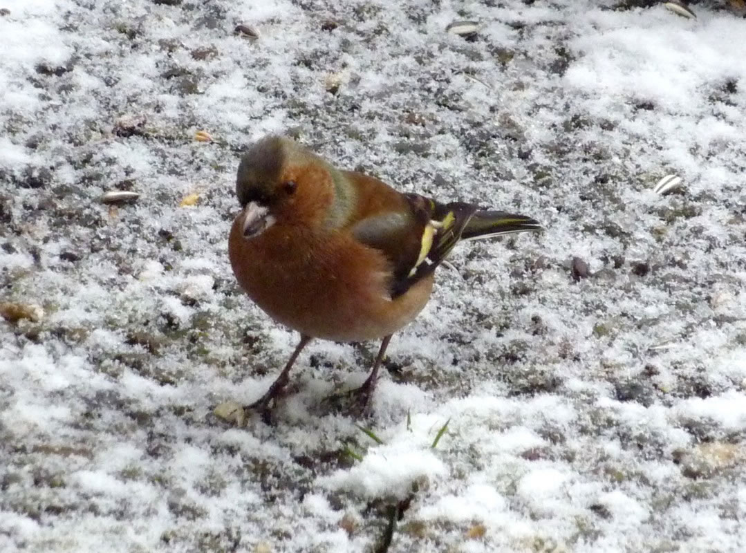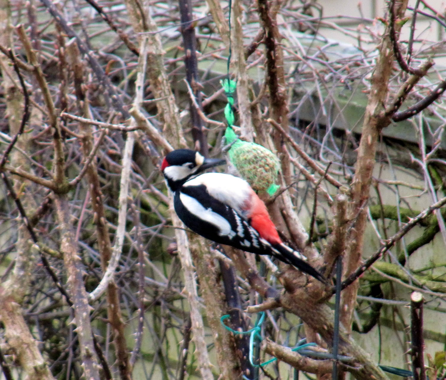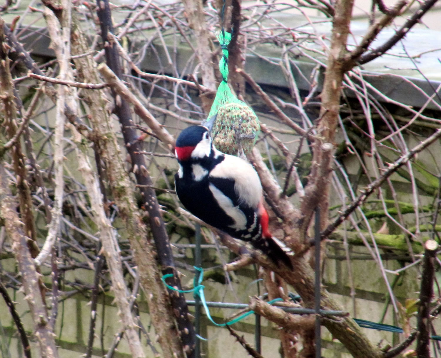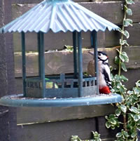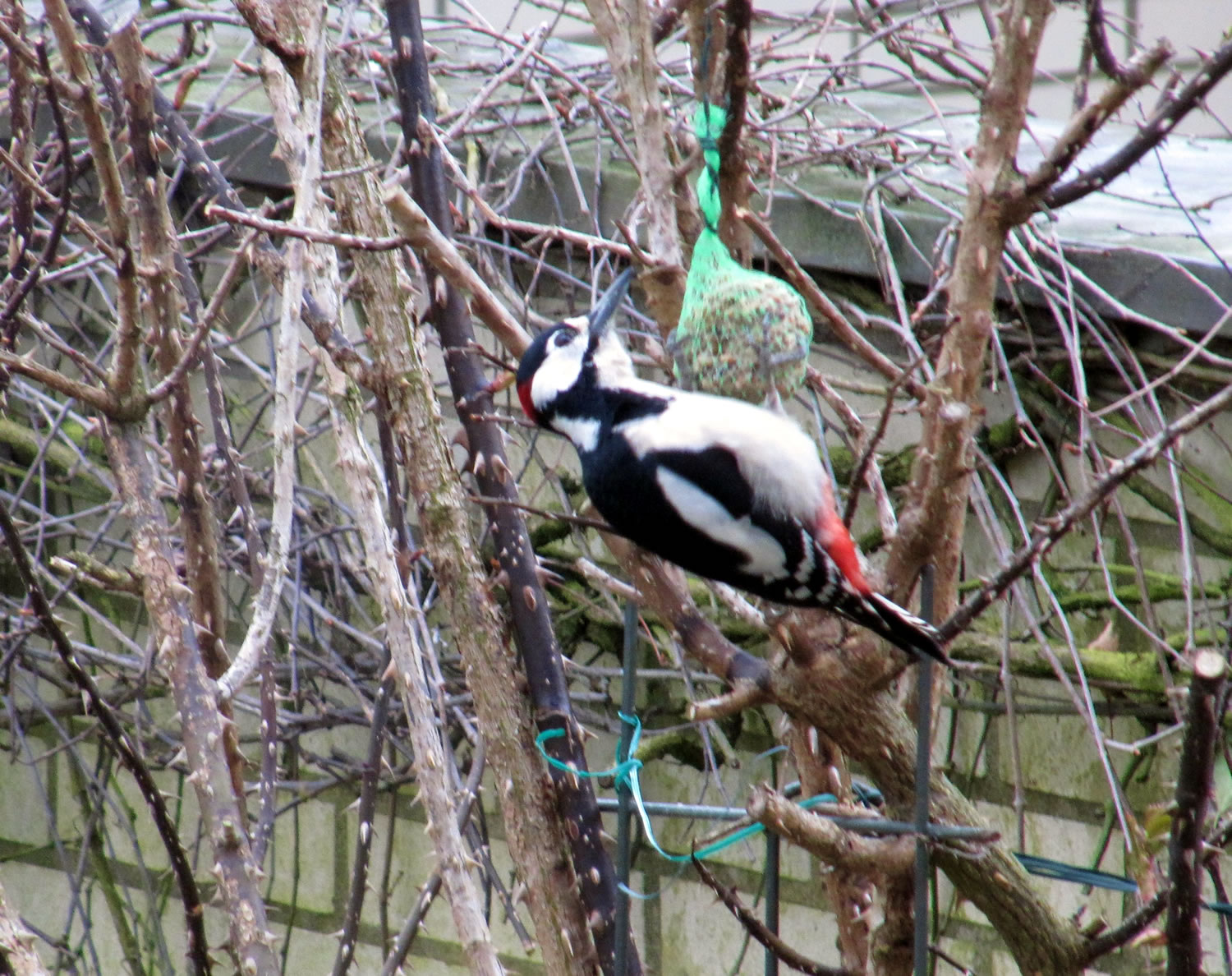Worüm ok jümmers, se sünd goot to höörn, de Spechte, man to sehn kriggt man dissen Vagel eher selten. Ik aver heff vör poor Daag Glück hatt. En Buntspecht harr sik över den letzten Meisenbüdel hermaakt, den mien leef Mann noch ruthangt harr. He harr dat nich licht mit den Meisenbüdel, de för veel lüttere Vagels maakt weer. Ik kunn em also "infangen". He weer wohl noch en jungen Vagel, denn he harr noch de rode Huuv up'n Kopp. De Biller köönt Se per Klick