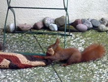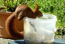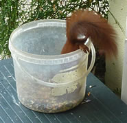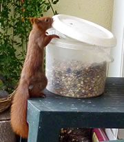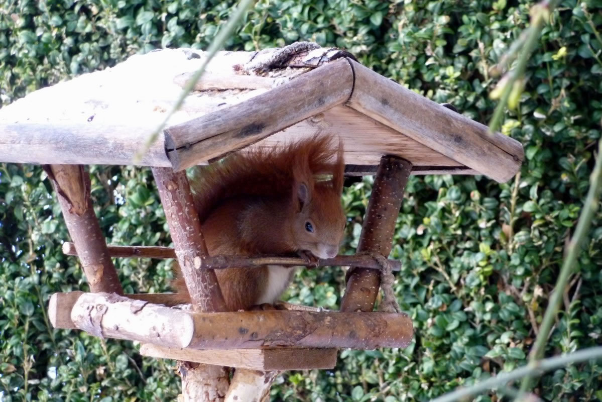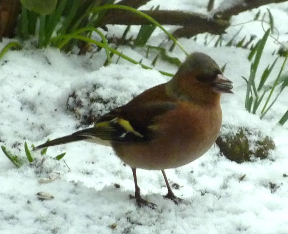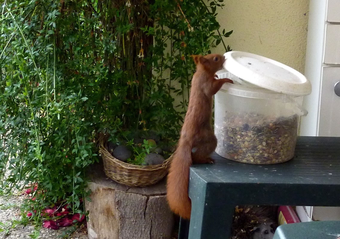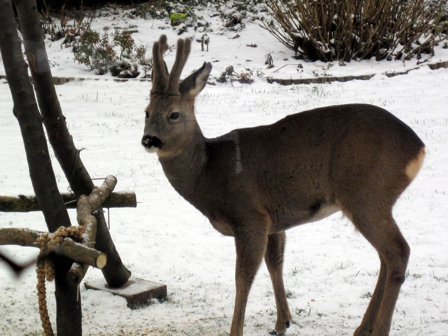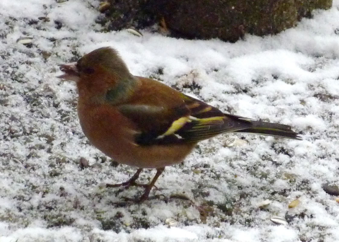 Worüm ok jümmers, se sünd goot to höörn, de Spechte, man to sehn kriggt man dissen Vagel eher selten. Ik aver heff vör poor Daag Glück hatt. En Buntspecht harr sik över den letzten Meisenbüdel hermaakt, den mien leef Mann noch ruthangt harr. He harr dat nich licht mit den Meisenbüdel, de för veel lüttere Vagels maakt weer. Ik kunn em also "infangen". He weer wohl noch en jungen Vagel, denn he harr noch de rode Huuv up'n Kopp. De Biller köönt Se per Klick