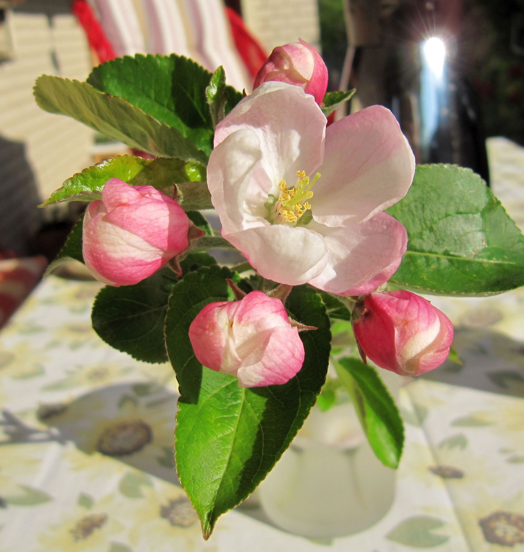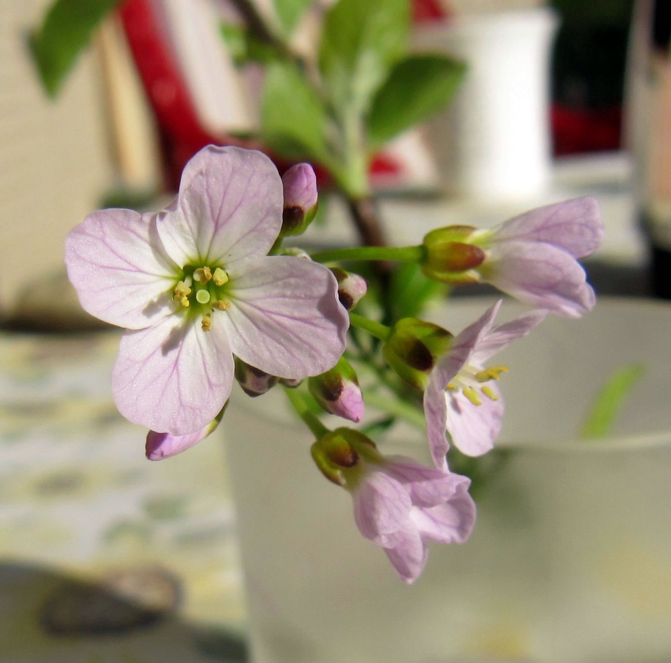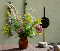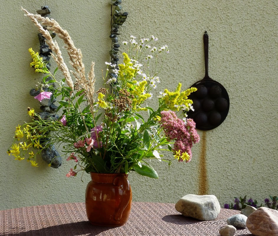 Dat Blatt mit de Galläppel much ik aver nich up mien Kaffeedisch lieden. Ik heff mi en poor Blomen ut mien Goorn haalt un dormit den Disch dekoreert. De Biller köönt Se per Klick