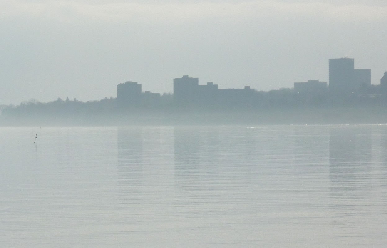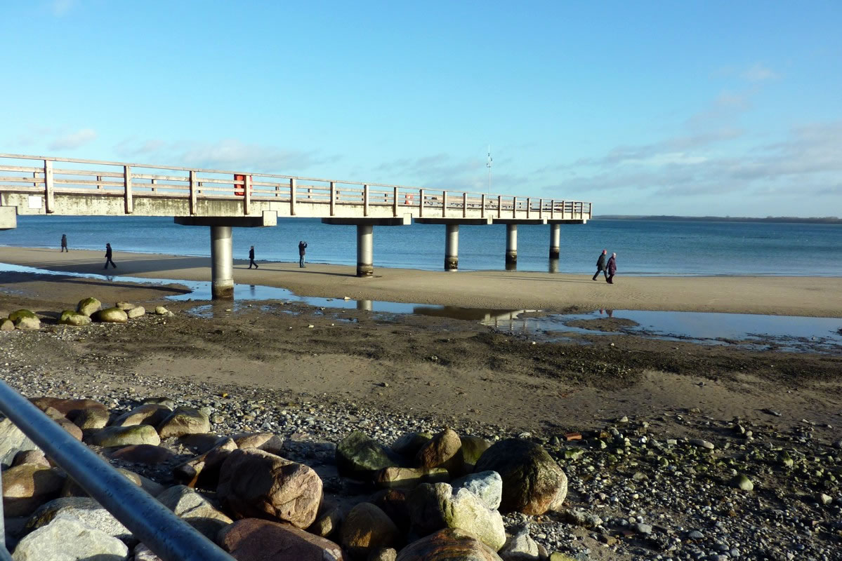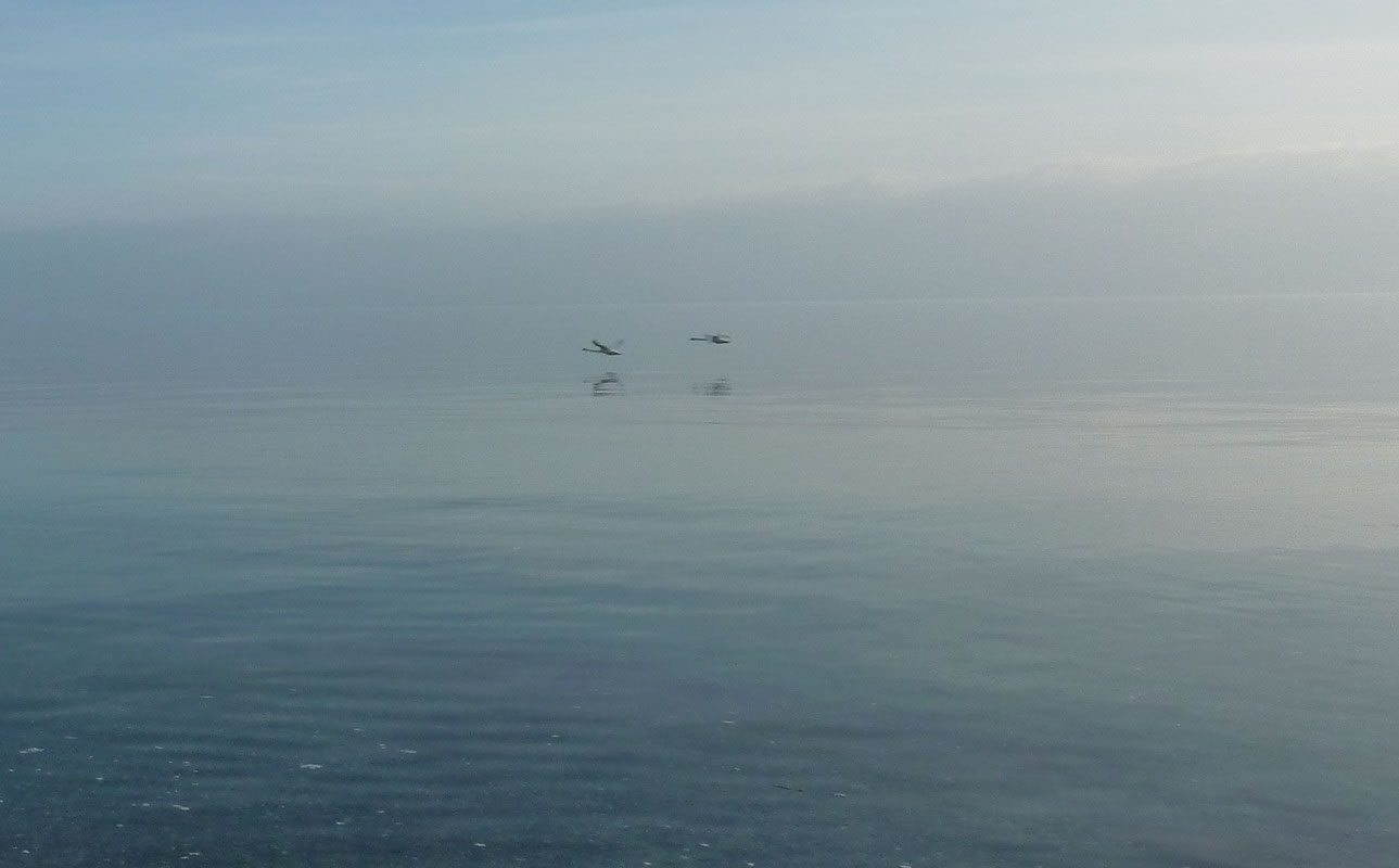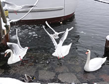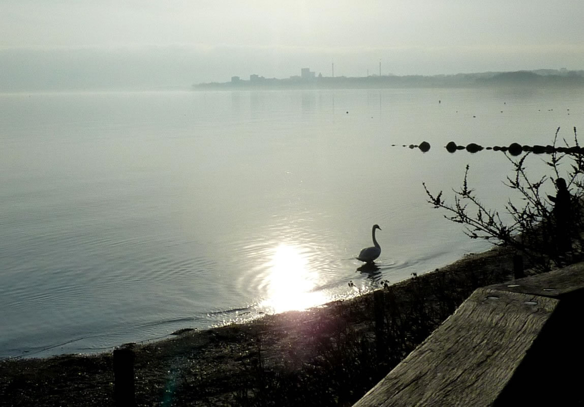 "Hest dat ok höört?, dor hett doch jüüst ganz liesen en Klock bimmelt?", fraag ik mien Mann. "Wat du allens höörst! Dat weer de Flunkenslaag vun de twee Swaans, de dor jüüst övert Water fleegt!" Ümmer mehr keem de Sünn to'n Vörschien. De Oostsee wöör noch blanker. In dat Water spegel sik nu de Stadt vun Gegenöver. Sehg meist as en Fata Morgana ut. De Stadt weer tweemal to sehn. Ik kunn mi nich beruhigen, harr noch dat Bimmeln vun de Klock in't Ohr. "Du, villicht hebbt wi de versunken Stadt Vineta sehn. Un ik heff de Klocken vun Vineta höört!" "Dien Phantasie geiht mal wedder mit di dörch", lach he un schüddel mit den Kopp. Vullenns keek de Sünn nu dörch den Nevel un spegel sik as en Füerball in't Water. Dorneven seet een vun de beiden Swaans. He möök de Flunken breet un floog övert Water. Nu höör ik ok den Flunkenslaag, dat weer keen Bimmeln vun en Klock. Ik harr vörher wull blots vun Vineta dröömt! De Biller köönt Se per Klick