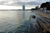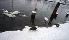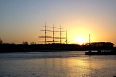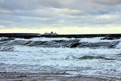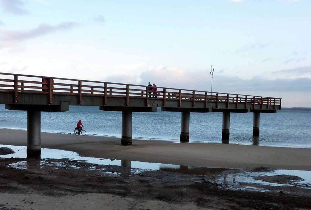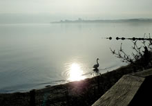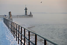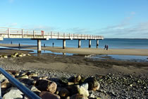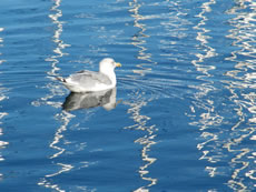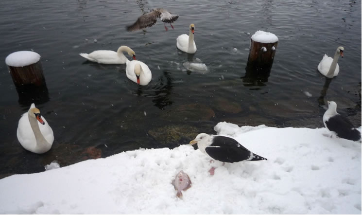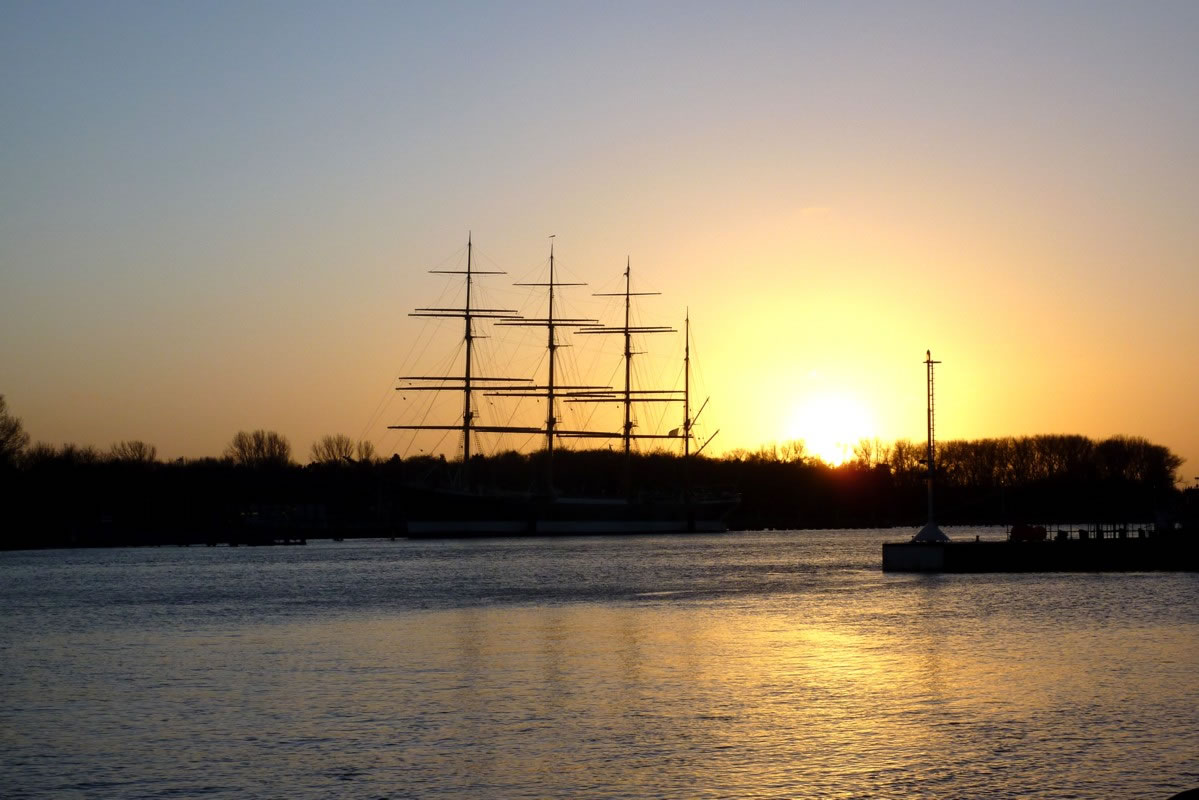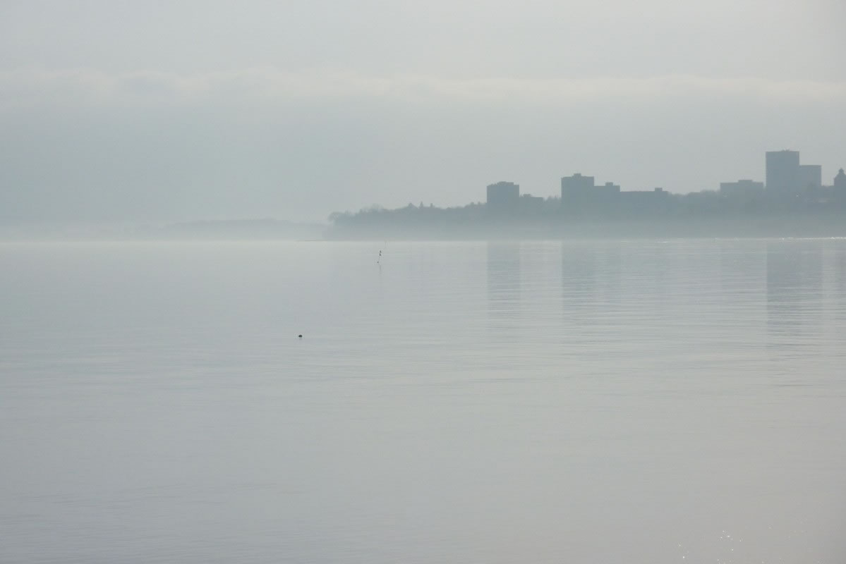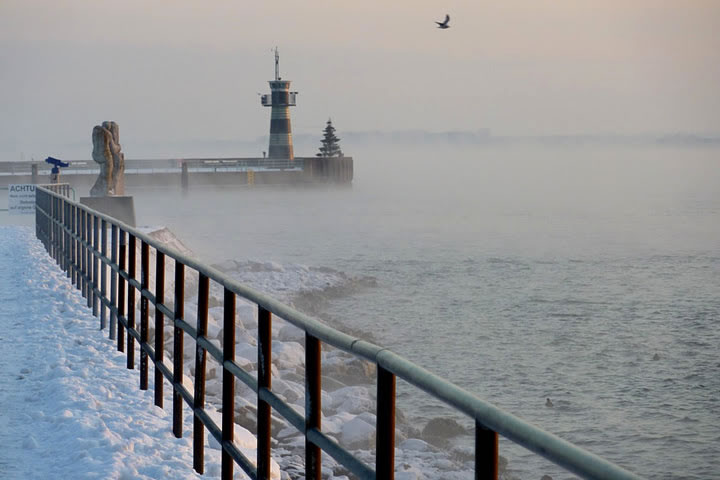 "Hest dat ok höört?, dor hett doch jüüst ganz liesen en Klock bimmelt?", fraag ik mien Mann. "Wat du allens höörst! Dat weer de Flunkenslaag vun de twee Swaans, de dor jüüst övert Water fleegt!" Ümmer mehr keem de Sünn to'n Vörschien. De Oostsee wöör noch blanker. In dat Water spegel sik nu de Stadt vun Gegenöver. Sehg meist as en Fata Morgana ut. De Stadt weer tweemal to sehn. Ik kunn mi nich beruhigen, harr noch dat Bimmeln vun de Klock in't Ohr. "Du, villicht hebbt wi de versunken Stadt Vineta sehn. Un ik heff de Klocken vun Vineta höört!" "Dien Phantasie geiht mal wedder mit di dörch", lach he un schüddel mit den Kopp. Vullenns keek de Sünn nu dörch den Nevel un spegel sik as en Füerball in't Water. Dorneven seet een vun de beiden Swaans. He möök de Flunken breet un floog övert Water. Nu höör ik ok den Flunkenslaag, dat weer keen Bimmeln vun en Klock. Ik harr vörher wull blots vun Vineta dröömt! De Biller köönt Se per Klick